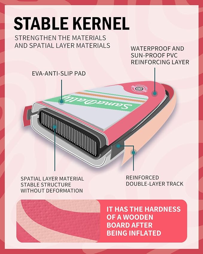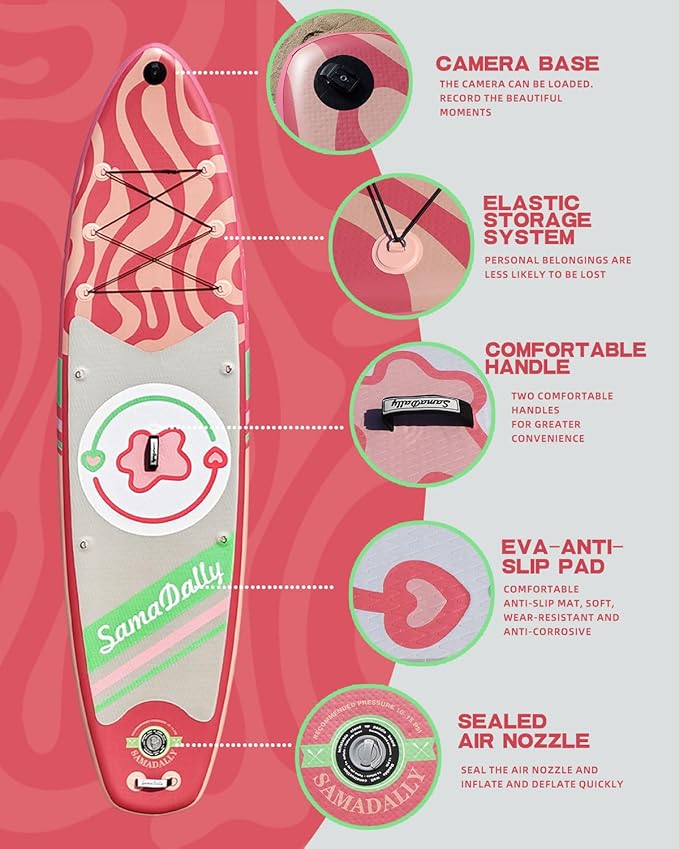 • Spacious & Enjoyable: SamaDally Candy Star series inflatable stand-up paddle boards are 1 to 2 inches wider than other similar products. 34in paddle surface is extremely spacious. Both beginners and paddleboards enthusiasts can find their own water - based fun on this SUP and enjoy a relaxing time.