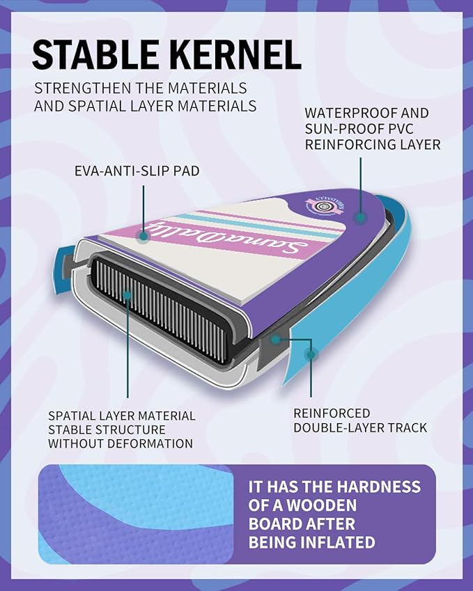 • Spacious & Enjoyable: SamaDally Candy Star series inflatable stand-up paddle boards are 1 to 2 inches wider than other similar products. The 34 - foot paddle surface is extremely spacious. Both beginners and paddleboards enthusiasts can find their own water - based fun on this SUP and enjoy a relaxing time.