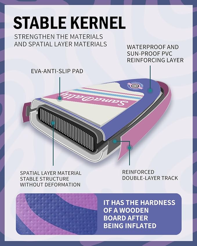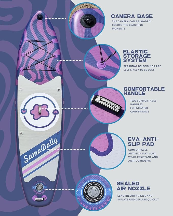 • Spacious & Enjoyable: SamaDally Candy Star series inflatable stand-up paddle boards are 1 to 2 inches wider than other similar products. The 34 - foot paddle surface is extremely spacious. Both beginners and paddleboards enthusiasts can find their own water - based fun on this SUP and enjoy a relaxing time.