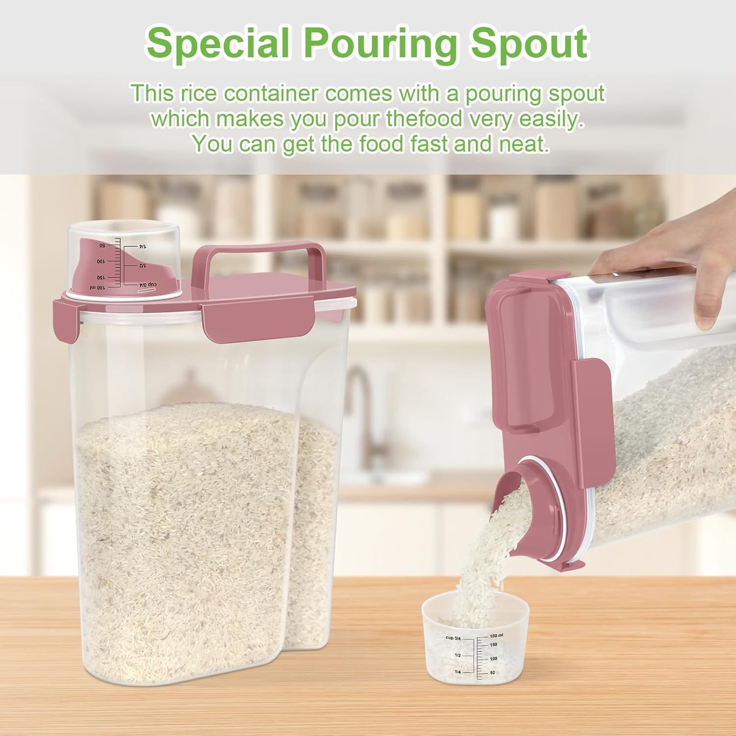 - UPGRADED EASY-POUR LARGE SPOUT: This rice Bin features a large pouring spout to easily dispense your ingredients. Its ergonomic design provides a comfortable grip for easy one-handed pouring.rice storage containers Slim compact and space-saving