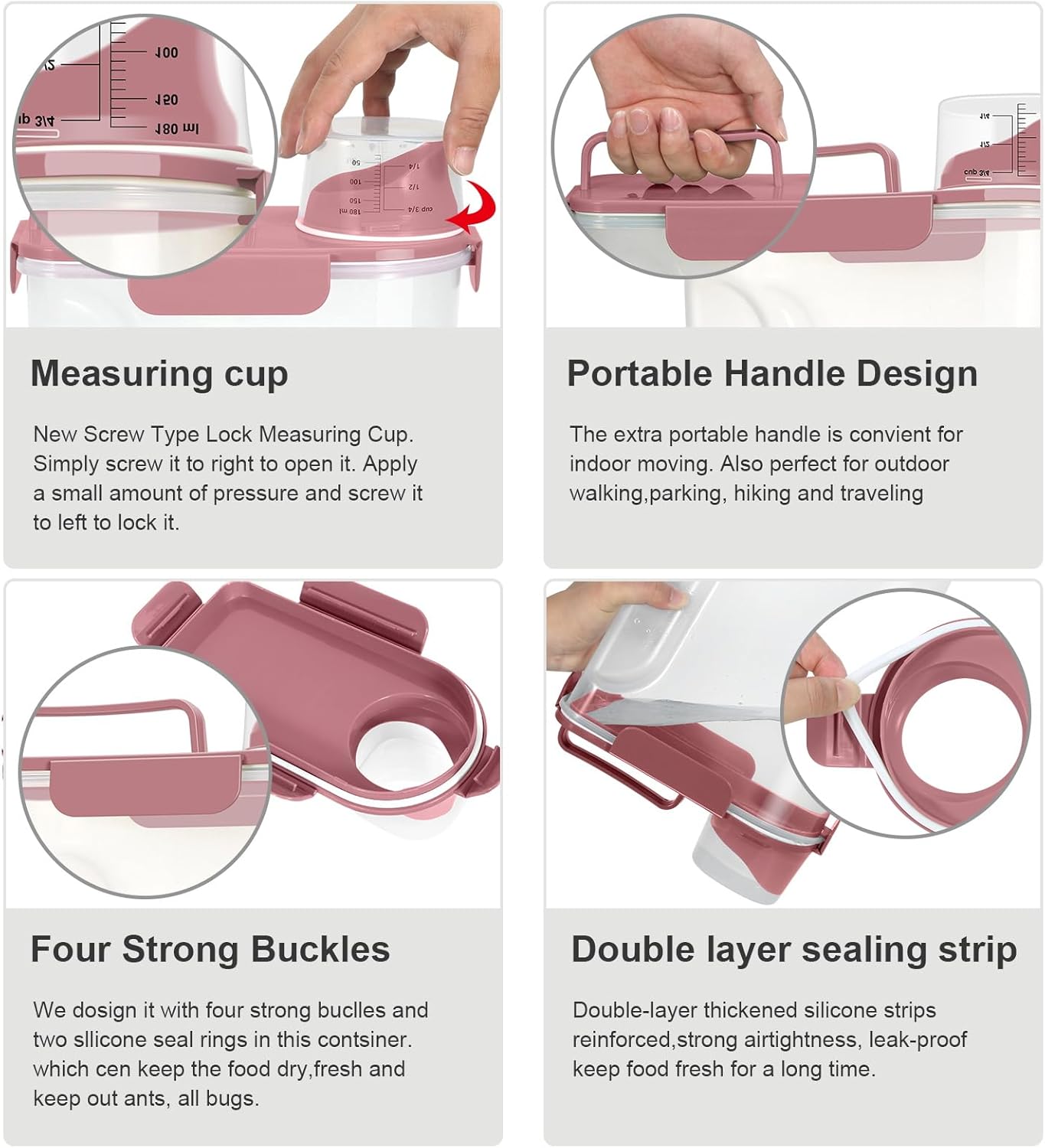 - CLEAR RICE HOLDER:The clear pet food container allows you to identify the contents at a glance,clear visibility and better organization.the cereal dispenser will keep your kitchen pantry neat and organized.there is also a portable handle for easy movement and going out