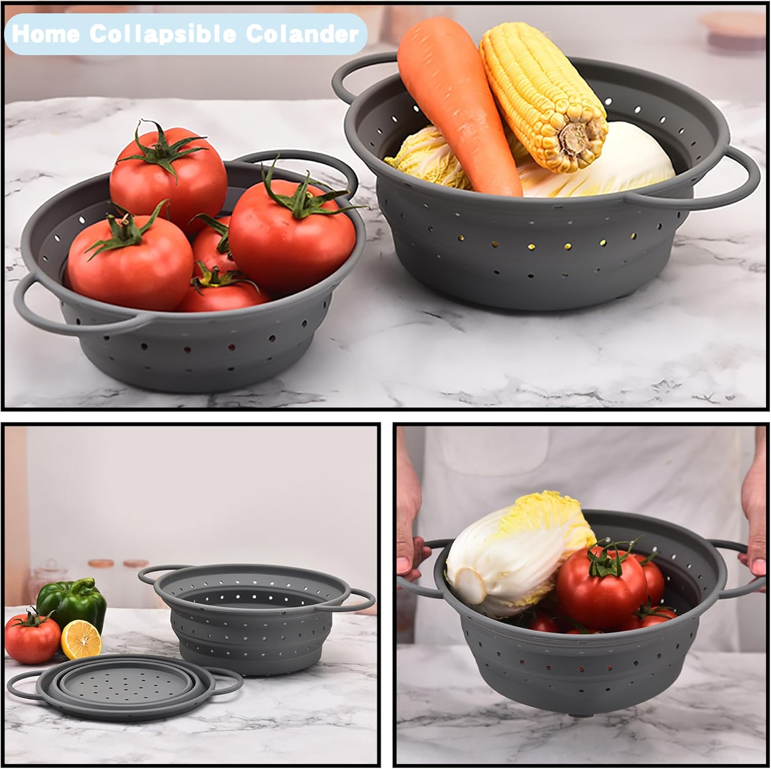 Silicone Collapsible Colander with Handle, Kitchen Colander for Easy Storage,Four-side Fast Draining Silicone Draining Basket, Perfect for Fruits Vegetables (Gray L+M)