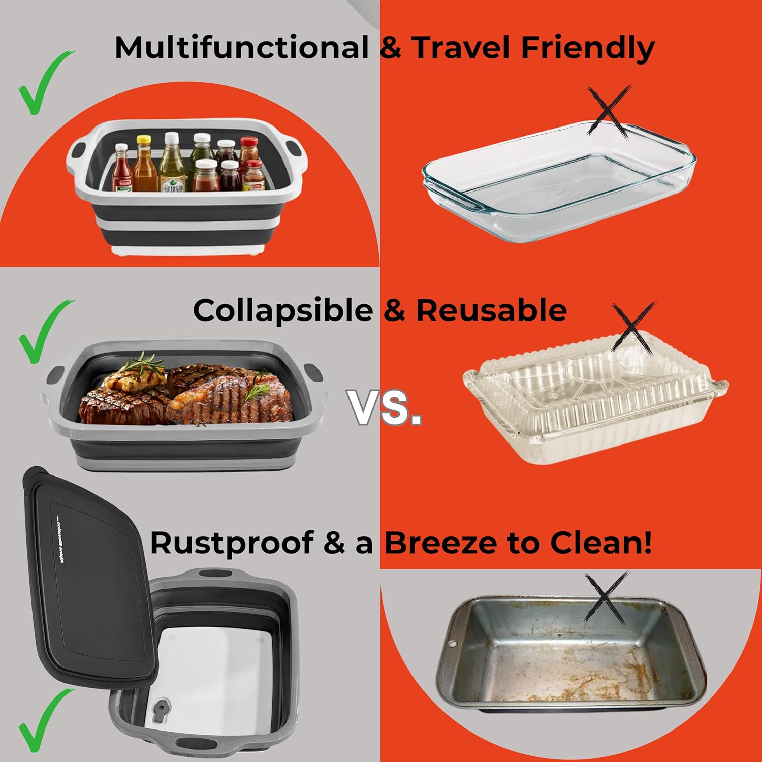 - Shape-Shifting Magic – Collapsible Design – Use fully expanded for large meal prep, half-collapsed for small batches, or fully flat for slicing or serving. Folds down to 1.5" for easy storage—perfect for camping, BBQs, RVs, tailgating, and small kitchens.