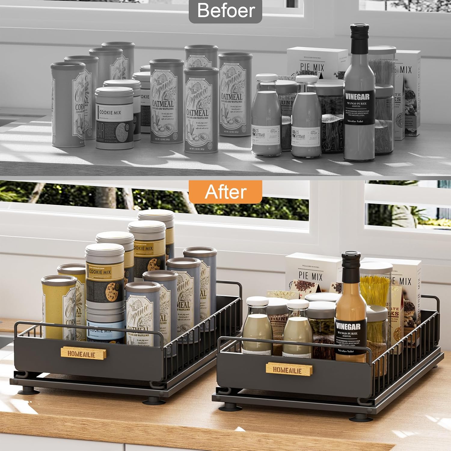- Expandable Space & Slide-Out Design:Kitchen cabinet organizer quickly access items with smooth pull-out sliding tracks (Noise-Reduction Damping Technology) — no more bending down to search under sink cabinets