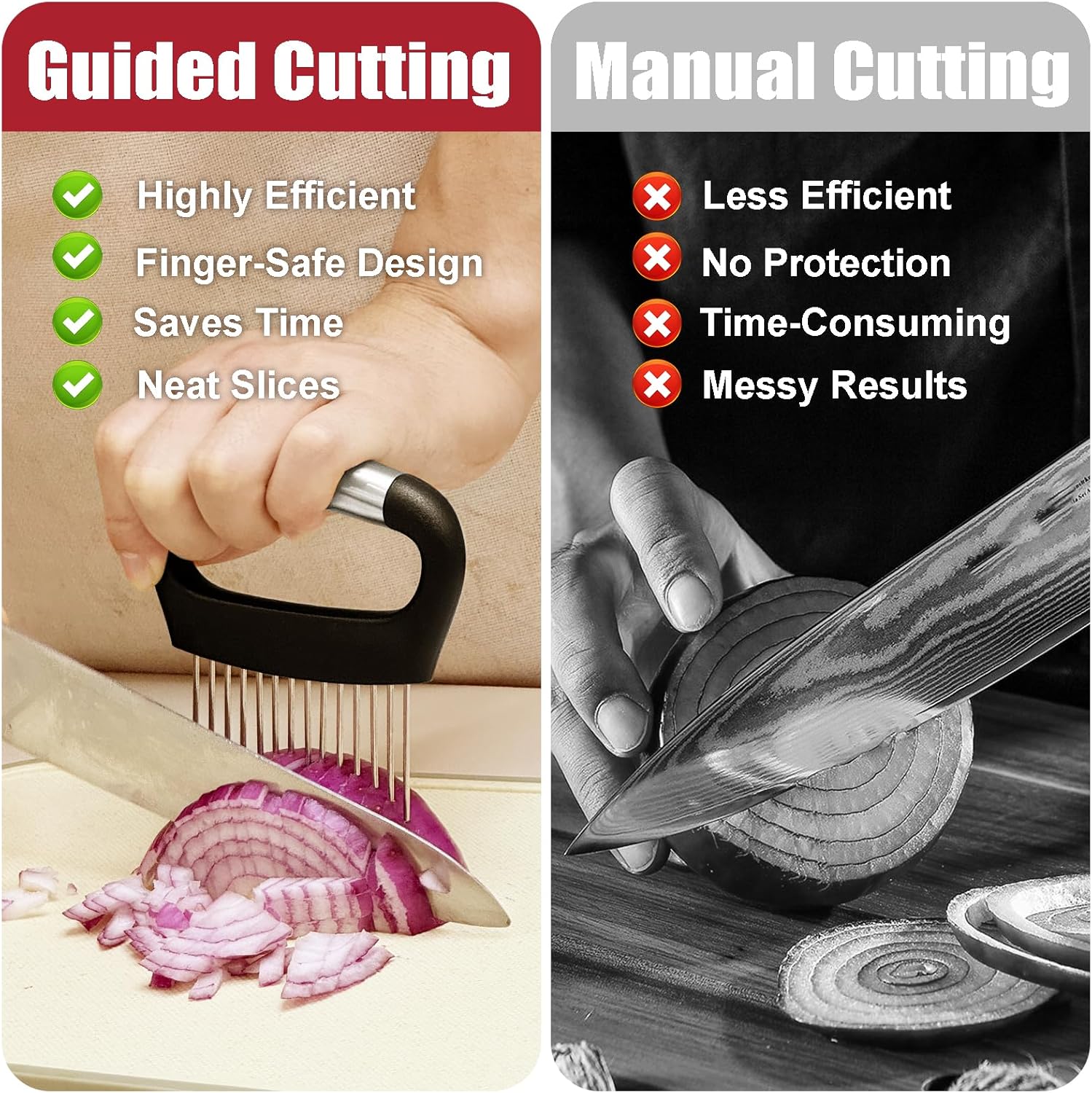 - Multipurpose Onion Slicer and Meat Tenderizer Tool: This professional-grade onion holder features 14 stainless steel needles that securely grip onions for perfect, even slices every time. Ideal for slicing tomatoes, potatoes, avocados while doubling as an effective meat tenderizer. Includes a storage cover for convenient organization and hygiene maintenance in your kitchen