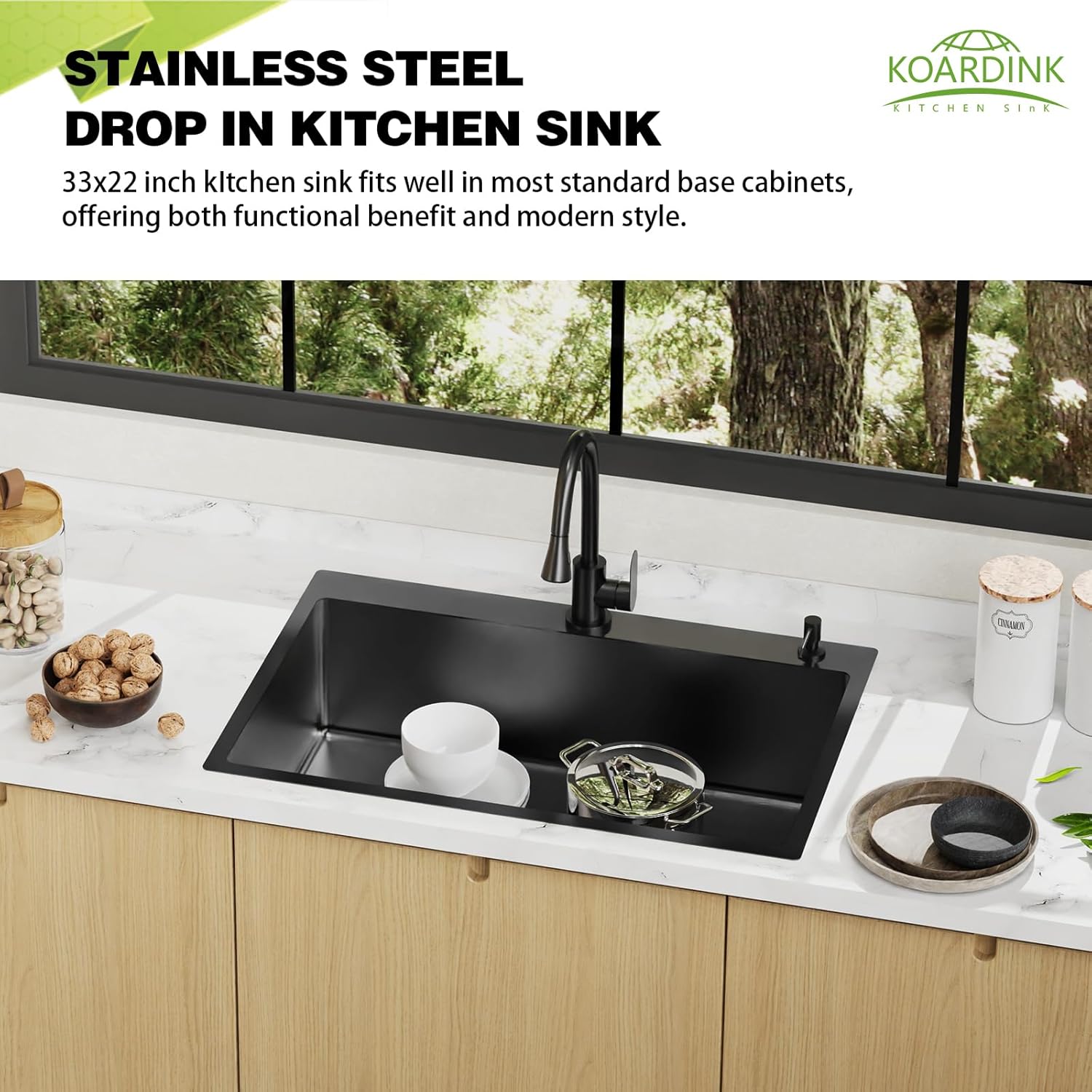 - Stainless Steel Sink: With exterior size-33"x22"x9", interior size 31"x18"x9", drop in black kitchen sink provides ample space for washing large pots, pans—streamlining meal prep and cleanup in both home and commercial kitchens. Stainless Steel kitchen sink combines a spacious, easy-to-clean work area with a footprint that fits most standard base cabinets.