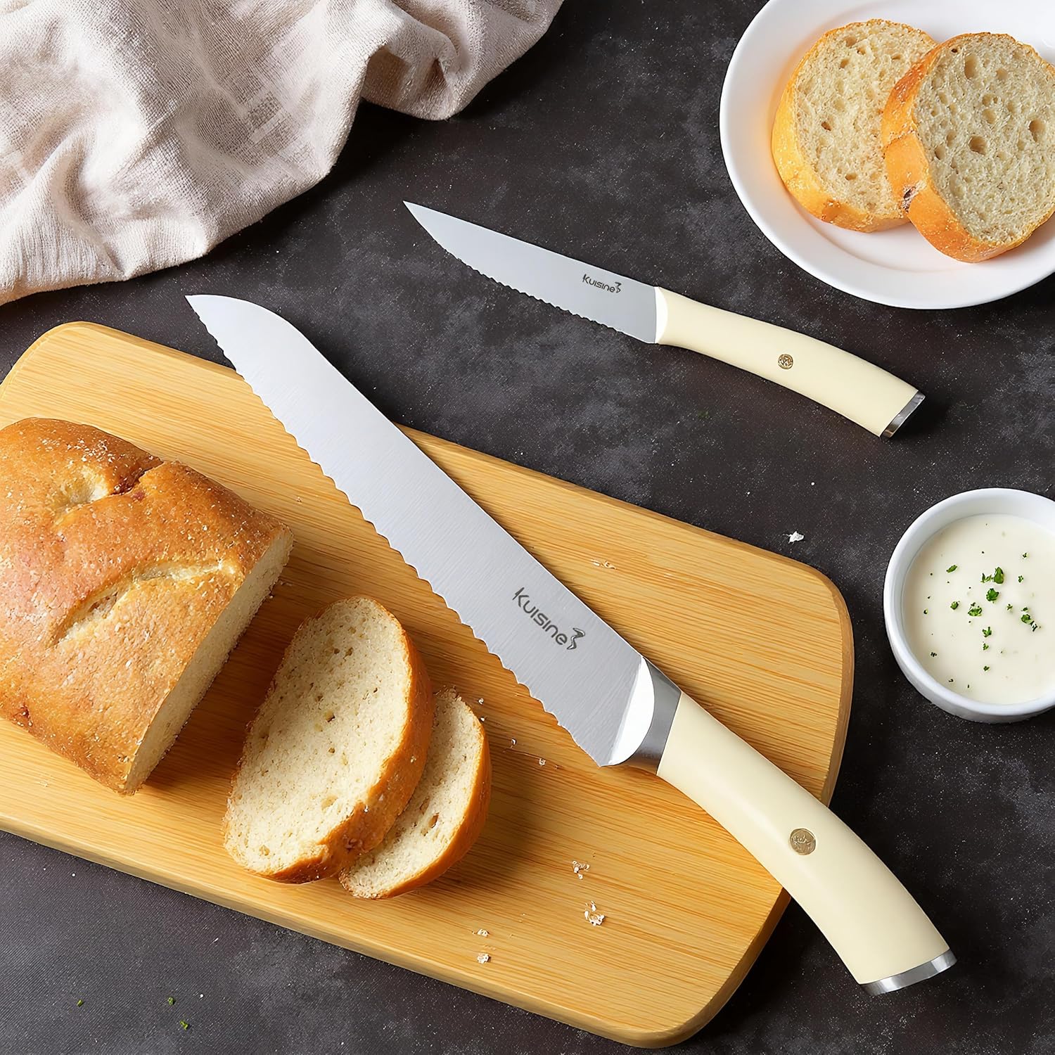 - Kuisine High Value Knife Set includes professional 8" chef knife, 8"Slicing Knife, 7" santoku knife, 8" serrated bread knife, 5"utility knife, 3.5"paring knife, 6pcs 5"steak knife set,1pair kitchen shear and a wooden block with built-in sharpener.
