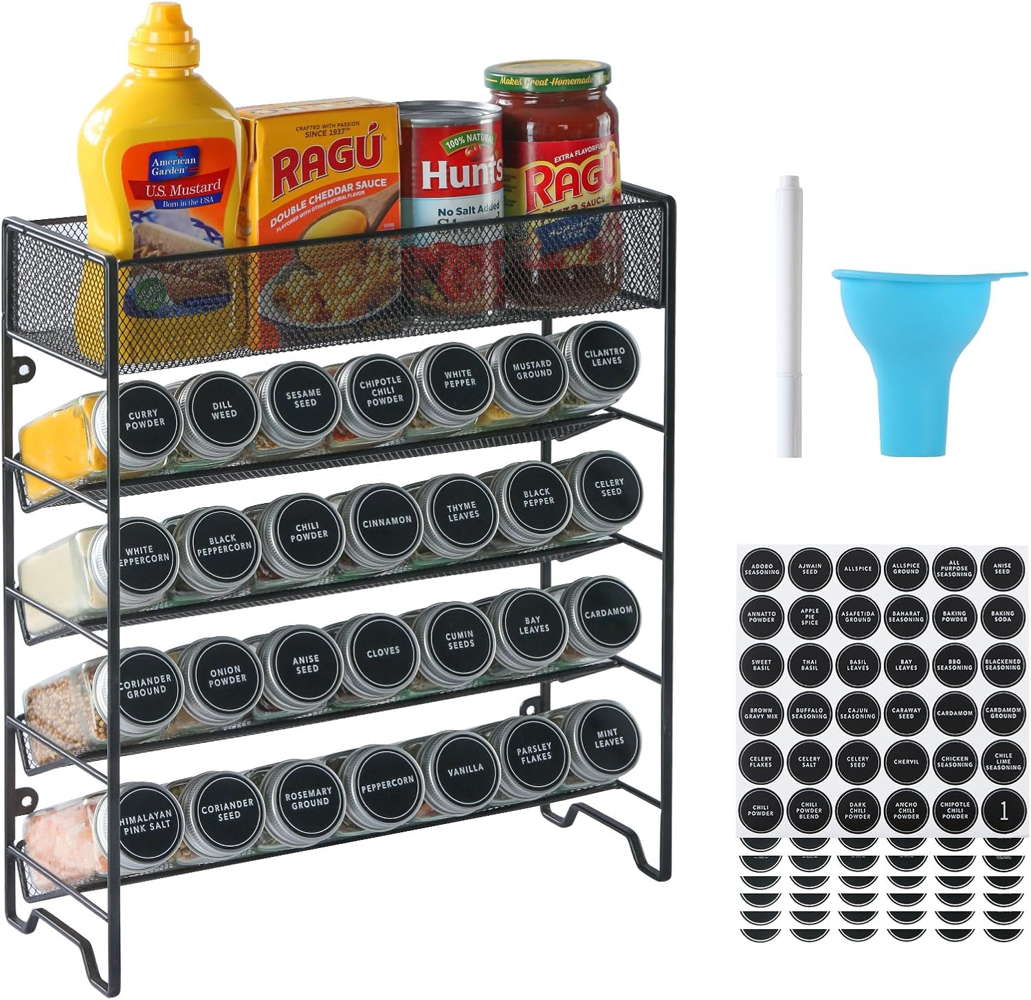 - 5 Tier Spice Rack - Made of strong steel and powder coatings electrostatic spray finished.Ideal sized spice rack organizer for cabinet, countertop, pantry, cupboard, door or wall mount. Inclined design make it easy to locate and quickly grab what you need, turn any mess of spice into an organized masterpiece .
