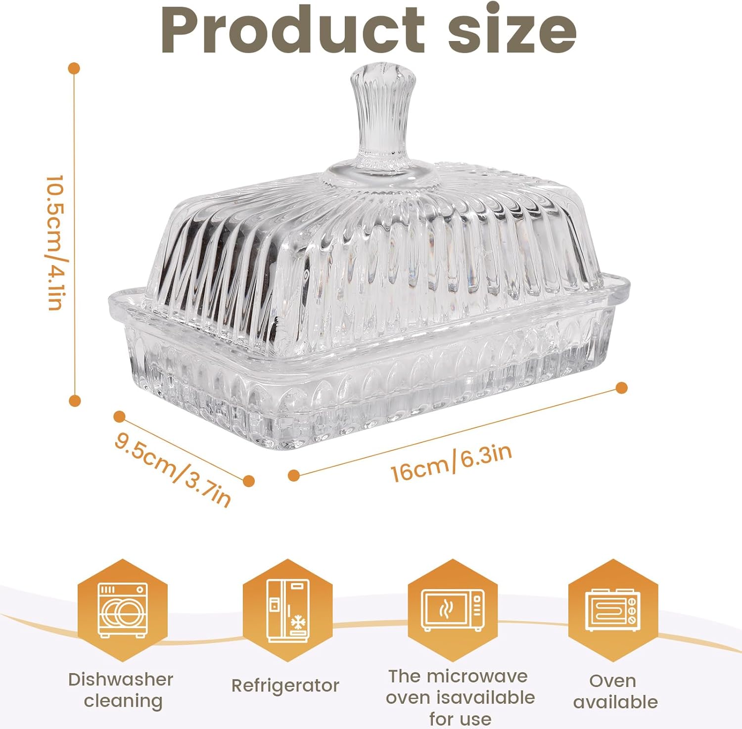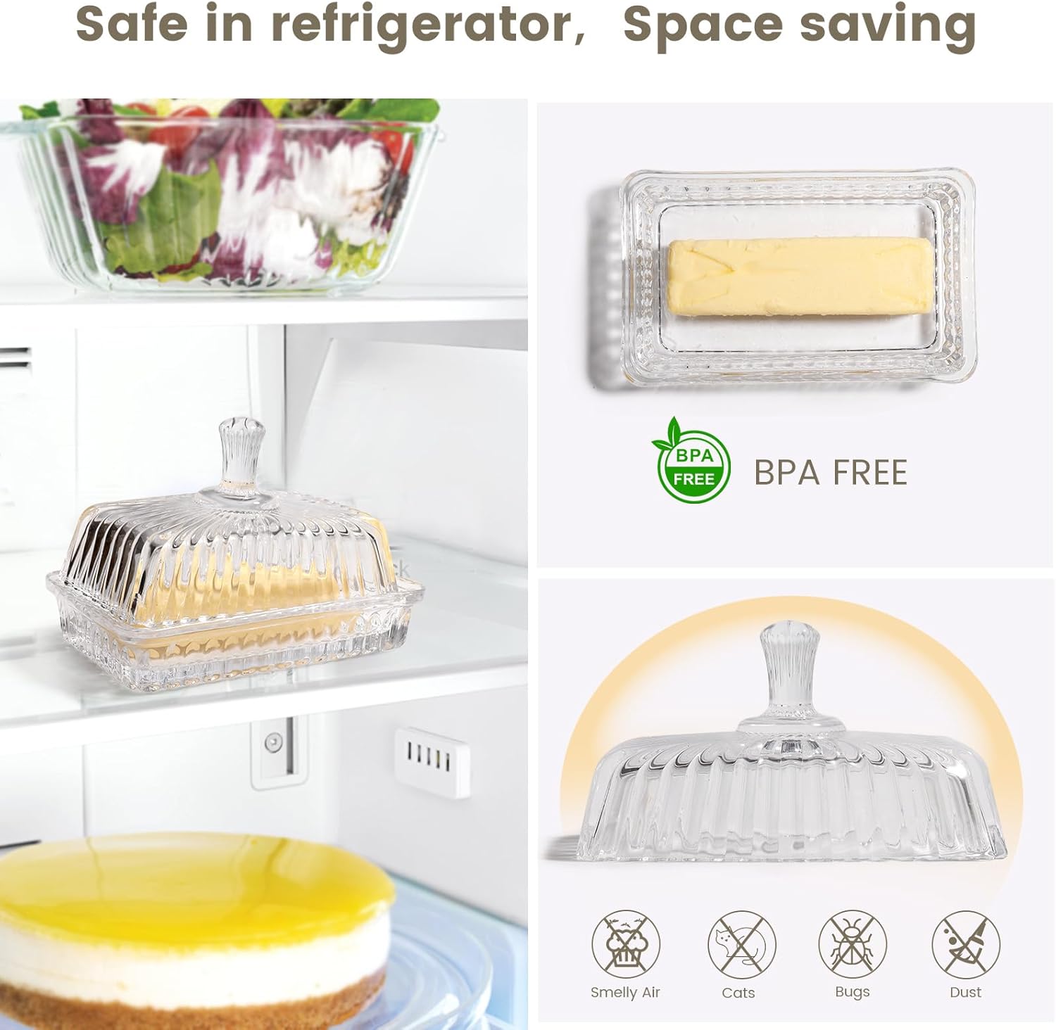 Wide Glass Butter Dish with Cover for Countertop,Vintage Crystal Butter Keeper for Counter,Covered Glass Butter Holder,Butter Holder for Refrigerator,Butter Tray with Two Stick 4oz Butter