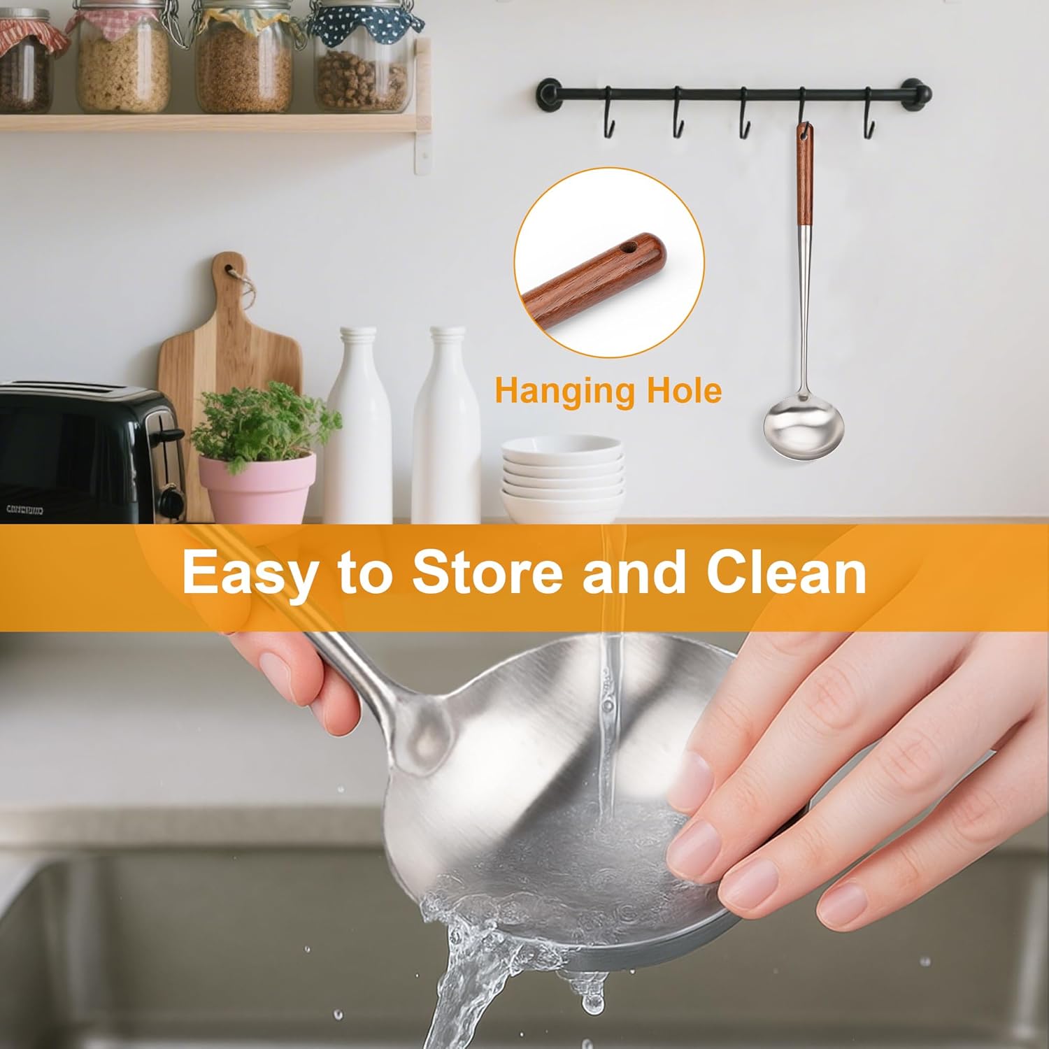 - Ergonomic, Heat-Resistant Wooden Handle: The metal ladle is designed with a comfortable, non-slip grip and heat-resistant handle, and it offers safe and effortless serving, even when handling hot liquids straight from stovetops or ovens.
