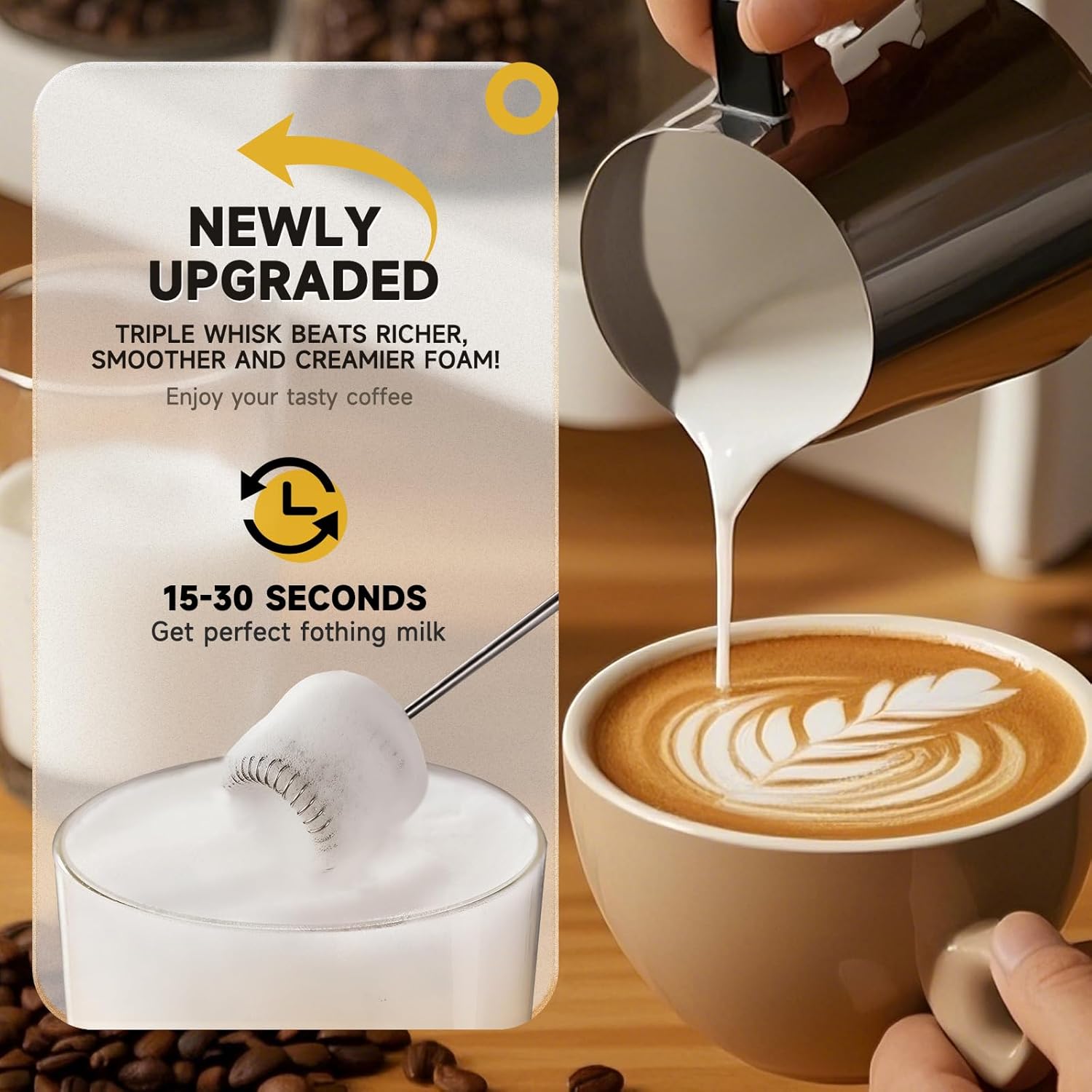 - 【Make Rich Creamy Froth In 15-30 Seconds】The milk frother gives that professional finishing touch to your latte, cappuccino, macchiato or hot chocolate. Make smooth and creamy forth at home without any trip to a coffee shop with your own milk frother rechargeable.