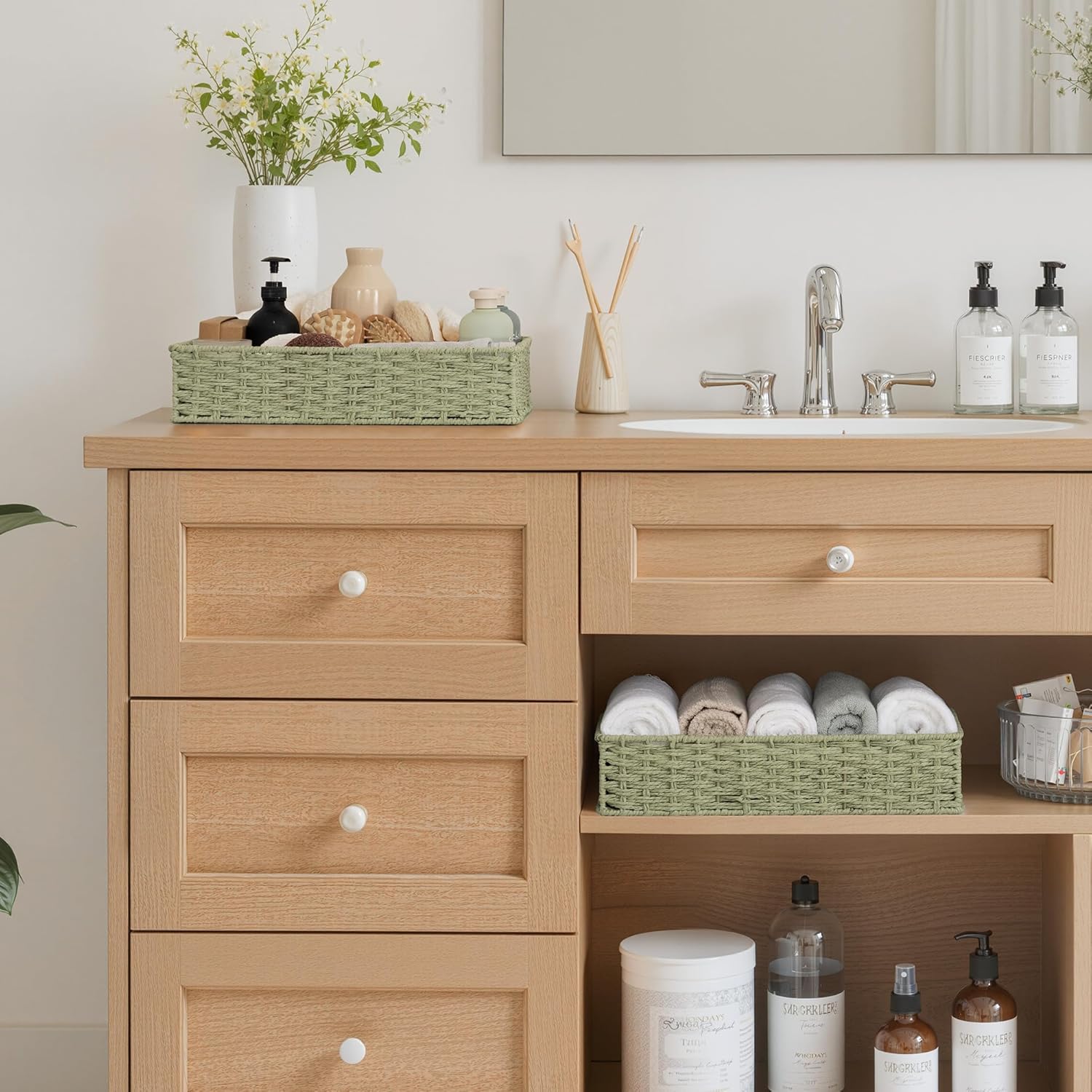 - Handwoven Craftsmanship: Each bathroom tray is expertly woven by skilled artisans, with uniform weaves that provide a delicate texture, adding warmth and style to your storage.