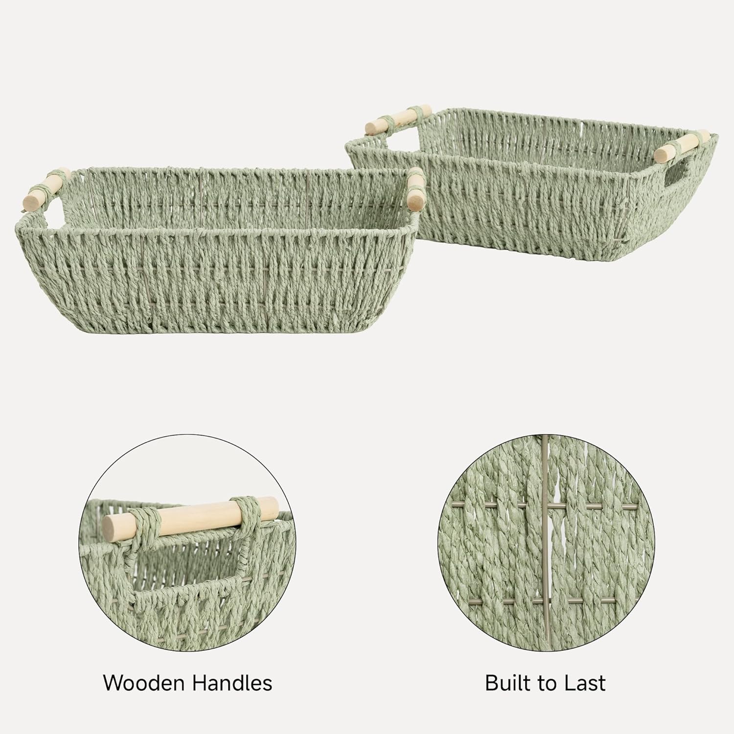 StorageWorks Extra Large Wicker Storage Basket for Organizing with Wooden Handles, Toilet Paper Baskets for Bathroom, Bosana Green, 2-Pack