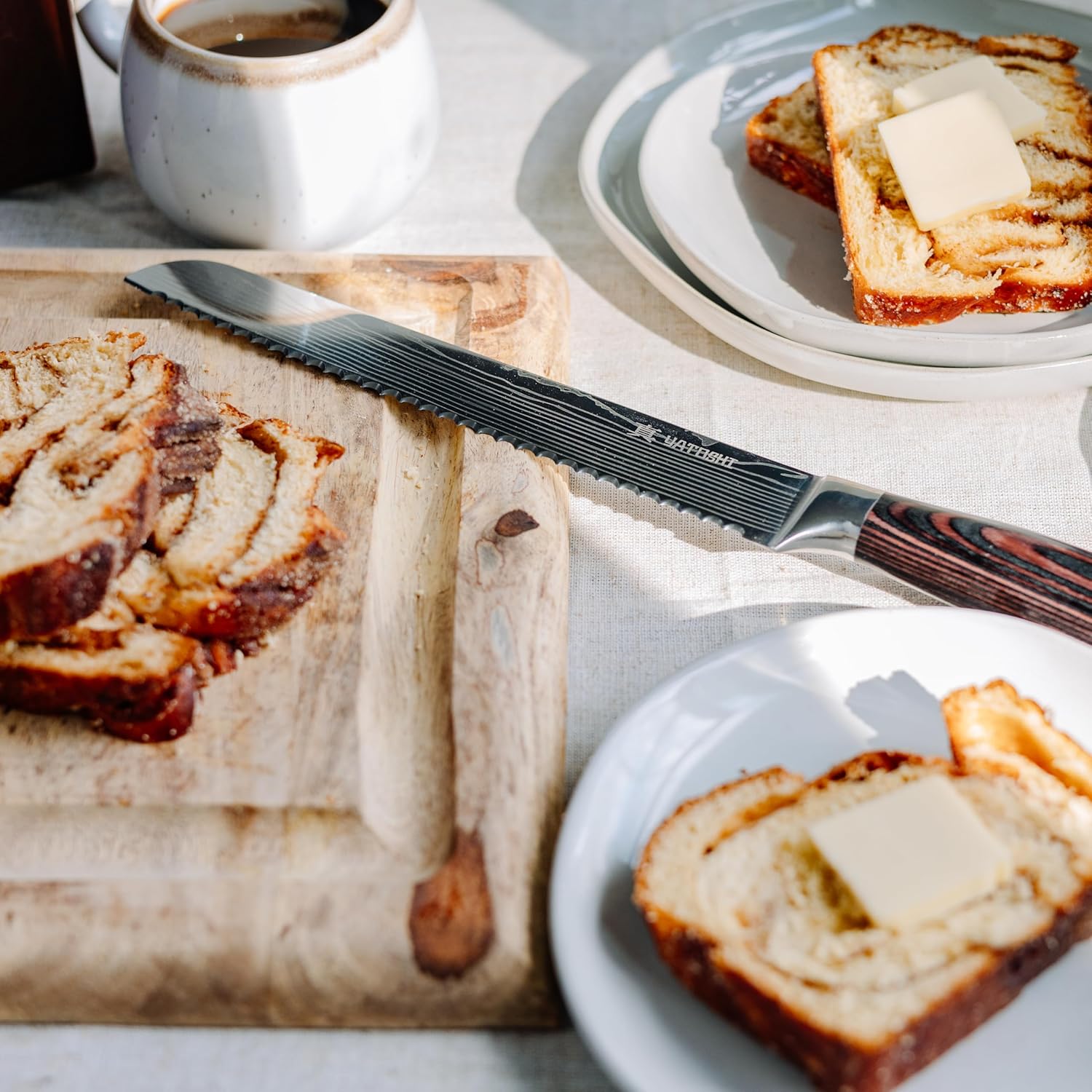 - High Carbon Blades: Made with premium 7Cr17 High Carbon Steel that provides a razor-sharp professional quality blade. The steel contains 0.6-0.75 carbon, making it two times tougher than other knives in its class with a Rockwell Hardness of 57-58. Each blade is finished with an elegant waved pattern that adds a touch of artistry while highlighting its precision craftsmanship.