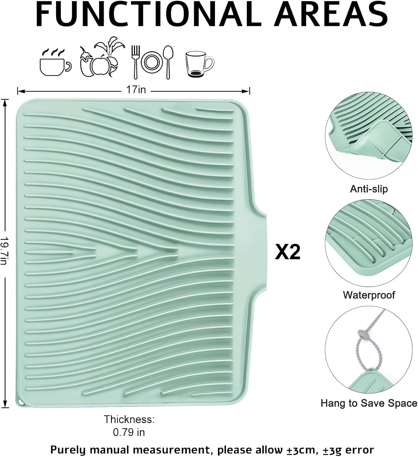 Dish Drying Mat, Stone Drying Mat for Kitchen Counter with Built-in Drain, Non-Slip Drying Matt Kitchen Counter, Heat Resistant Silicone Drying Mat, Dish Drying Pad, 2 Pcs (Mint 19.7" x 17")