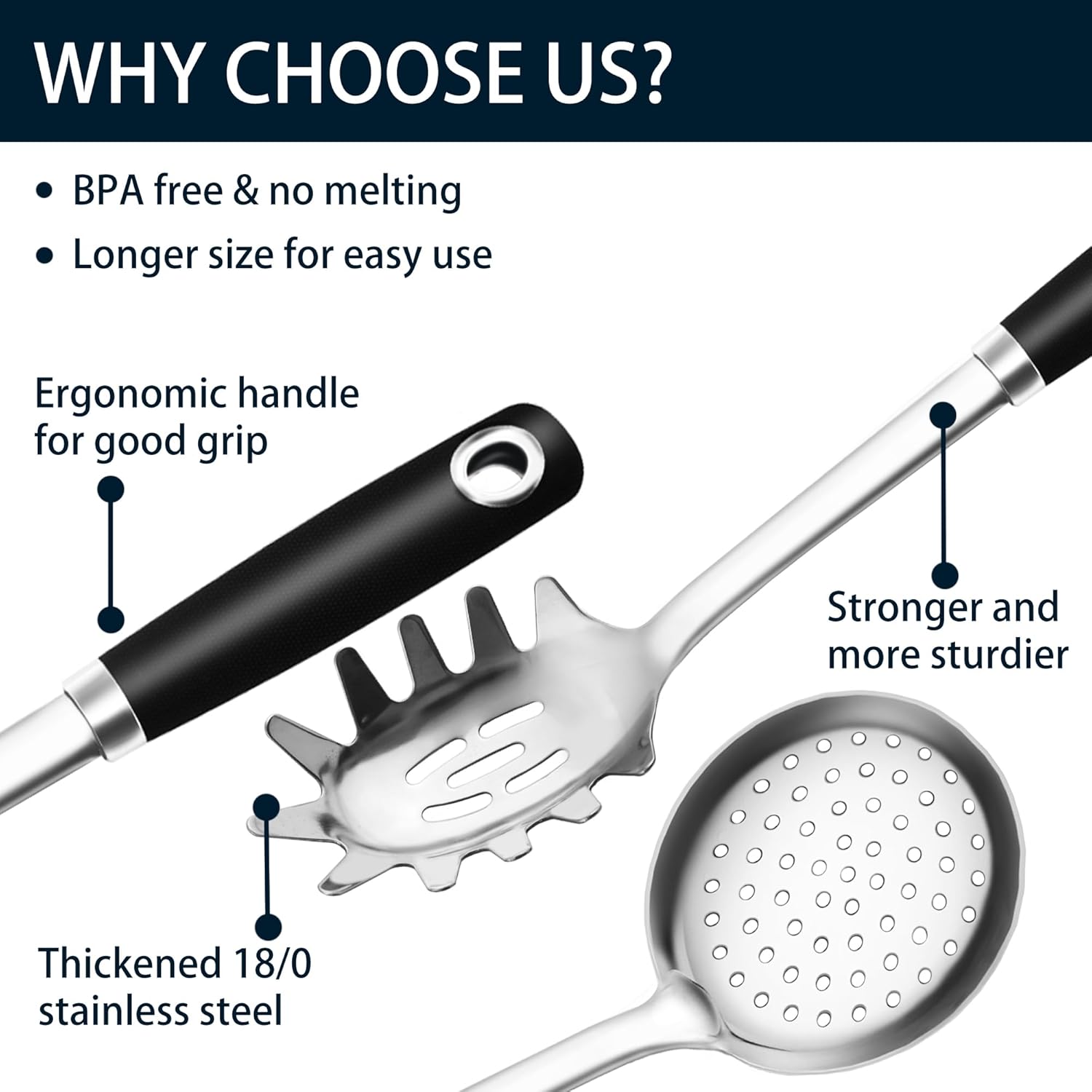 - WHY 18/0 STAINLESS STEEL - Won't melt or break like silicone cooking utensil and won't mold like wooden utensil, a healthier choice that keeps you away from silicone PFAS PFOA PTFE etc,.!