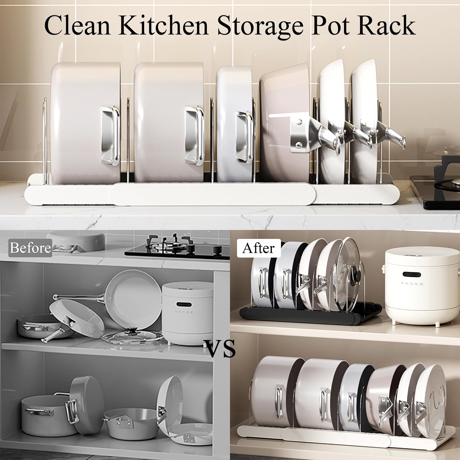 - Pan organizer rack is suitable for organizing pans, lids, cutting boards, baking sheets, cookware in cabinet, under-sink, shelves, drawers and countertops