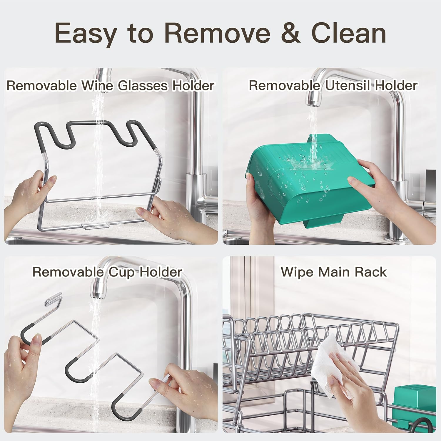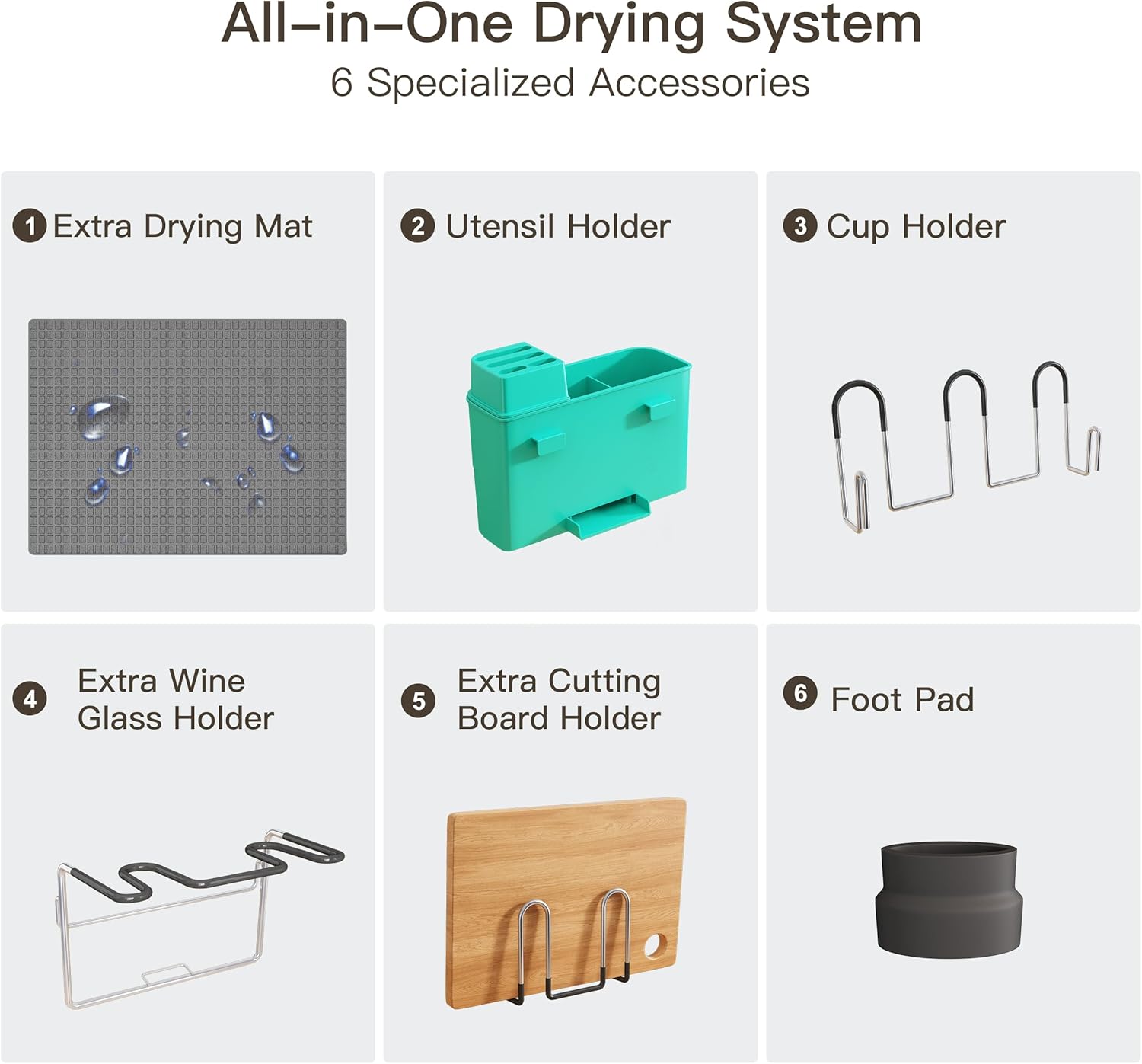 - 🛠️ All-in-One Drying System: 7 specialized accessories: drying mat, utensil holder, drainboard set, wine glass holder, cup holders, cutting board slot, non-slip feet cover. Stores all dish types vertically or horizontally. Maximizes small kitchens