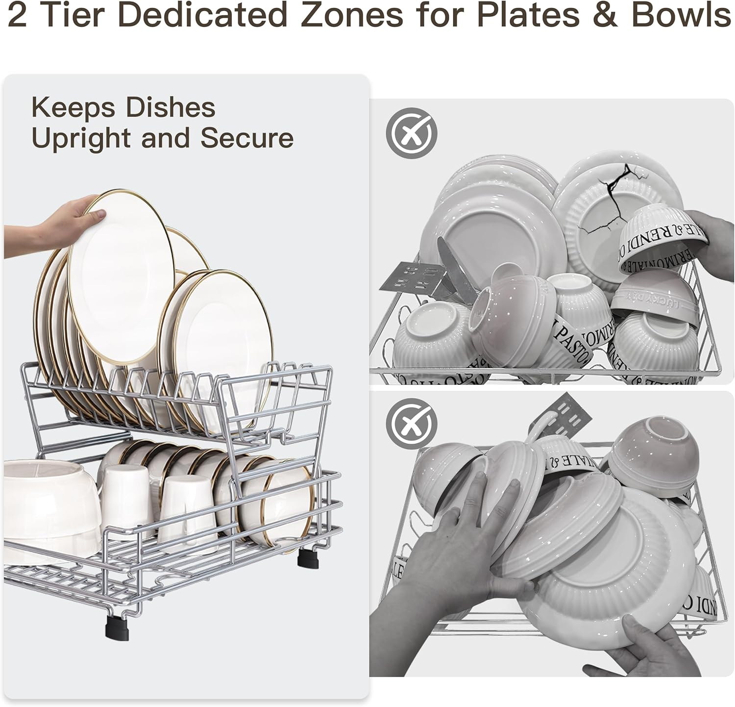 - 🔄 2-Tier Dish Rack for Kitchen Counter Storage: Dedicated zones for plates, bowls, and utensils. Sturdy frame prevents tipping—dish drainer rack keeps everything upright and secure
