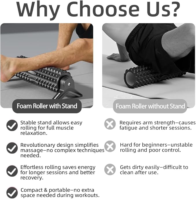 • 2025 Upgraded Foam Roller with Fixed Non-Slip Stand: No Assembly Needed! Unlike other grid foam rollers that roll away, our built-in stand keeps it stable right out of the box. Just place it down and roll! A foam roller with a fixed stand is more stable than standard foam rollers¡ªno slipping or chasing during use, making massage easier and more efficient. Perfect for beginners or SMALL SPACES, it offers hands-free convenience and better control.