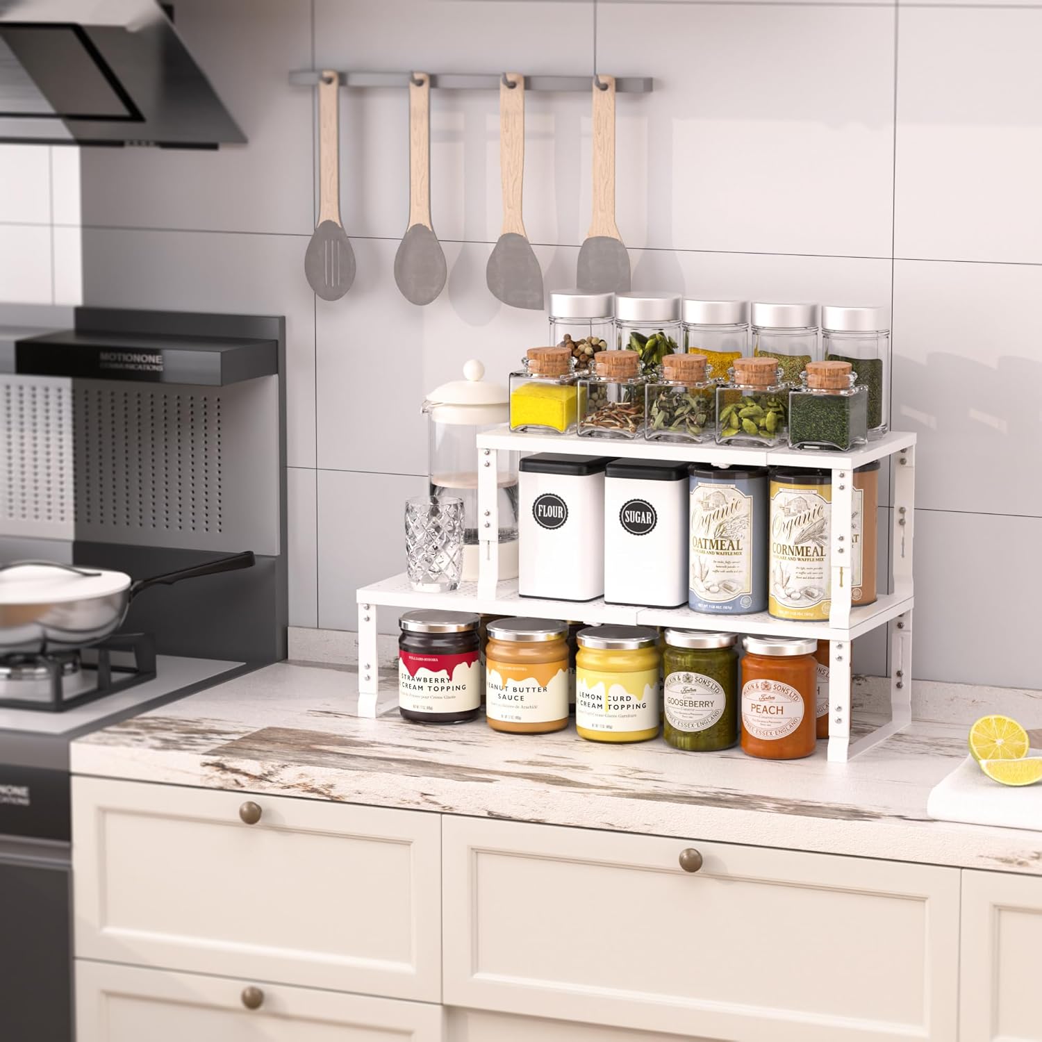 Heavy-Duty Adjustable Metal Shelf Organizer - Expandable & Stackable Pantry Storage Rack for Kitchen, Bathroom, RV, Cabinets(2 Packs/White, Medium)