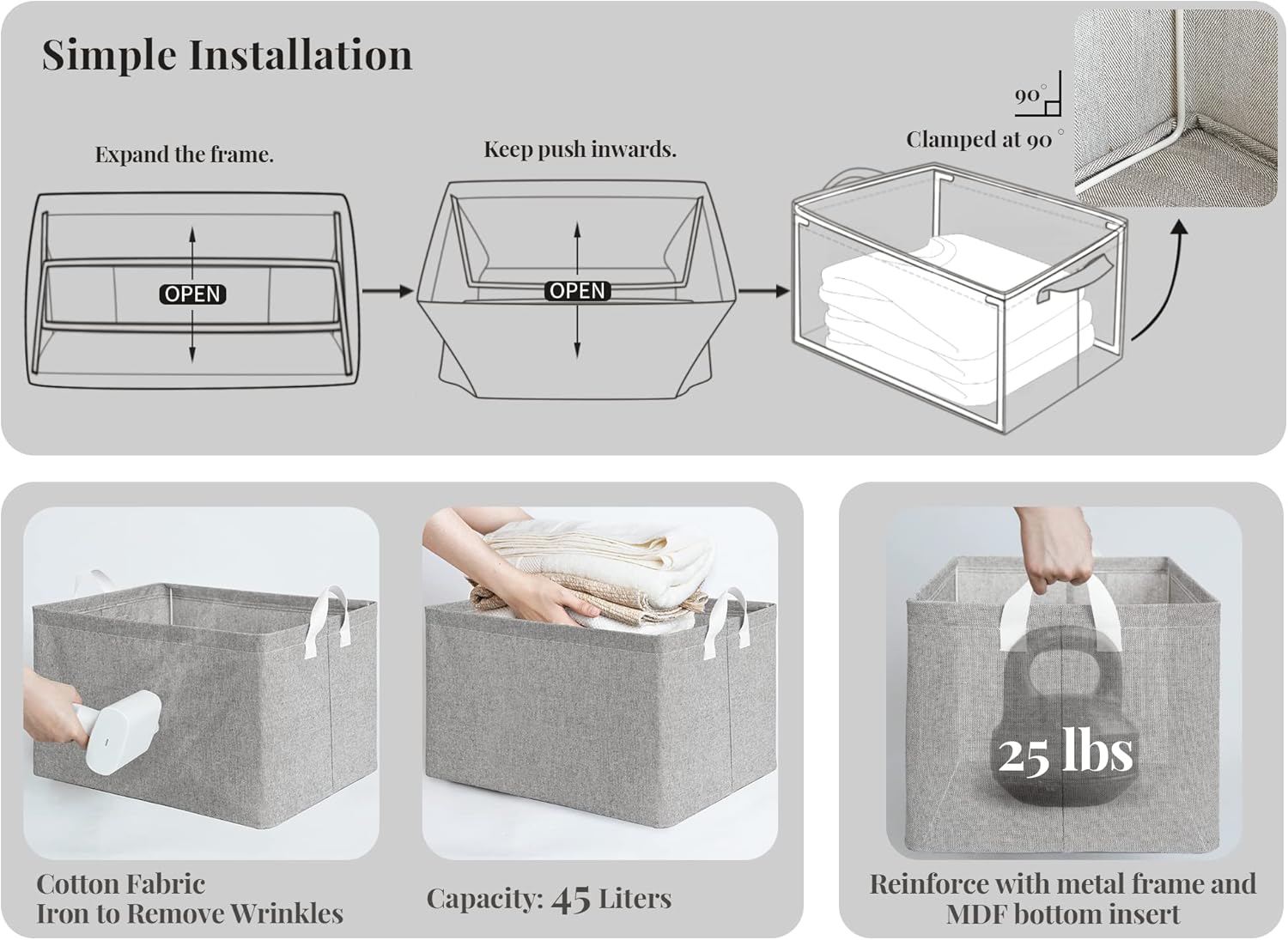 - Structured Stability: Metal frame and reinforced bottom keep bins standing tall, preventing collapse even when packed with heavy sweaters or bath towels.