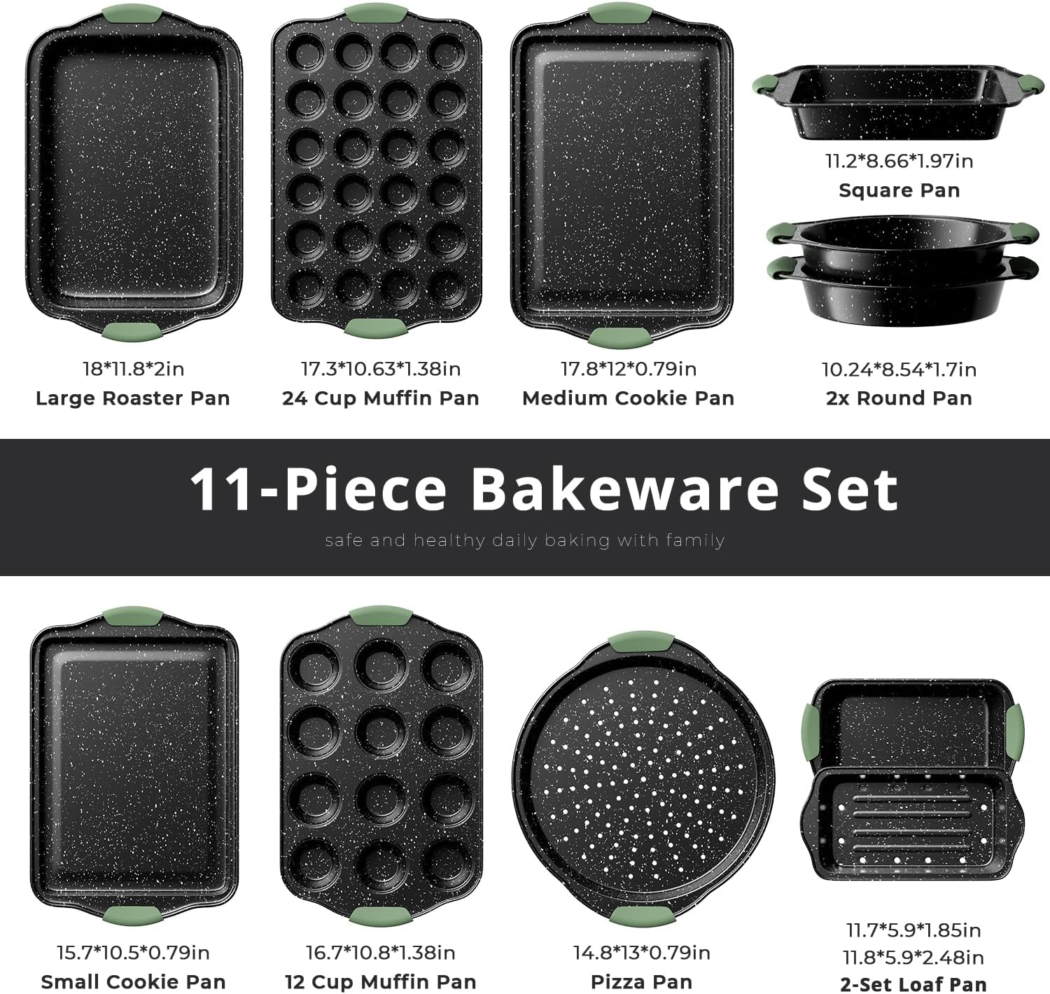 11-Piece Nonstick Bakeware Set, Stackable & Oven-Safe Kitchen Baking Pans with Silicone Handles - Includes Cookie Sheet, Cake Pan, Muffin Tin, Pizza Stone & Bread Loaf Pan, Dark Green&Black