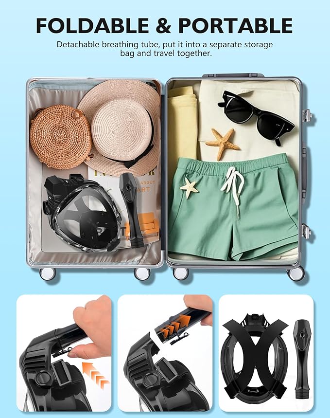 • 【FOLDABLE & COMFORTABLE TO WEAR】- This full face snorkeling mask has a foldable design, and the snorkel can be easily removed and put into the storage mesh bag, which is convenient for storage and travelling. The skirt is made of a large area of ​​food-grade liquid silicone, environmentally friendly and odourless, and it is soft and comfortable to fit the facial contour perfectly, long time wearing won't bring you pressure, so you can easily enjoy the infinite fun of diving.