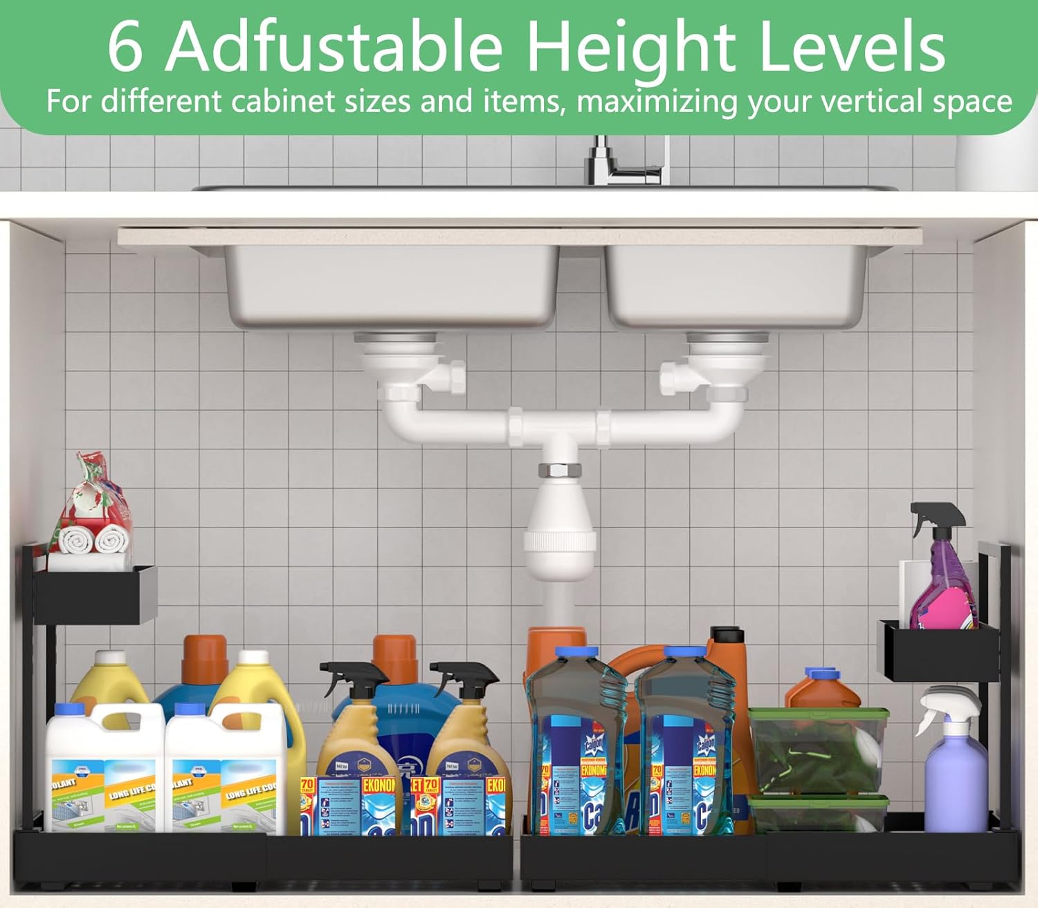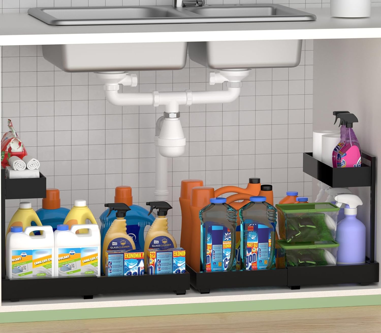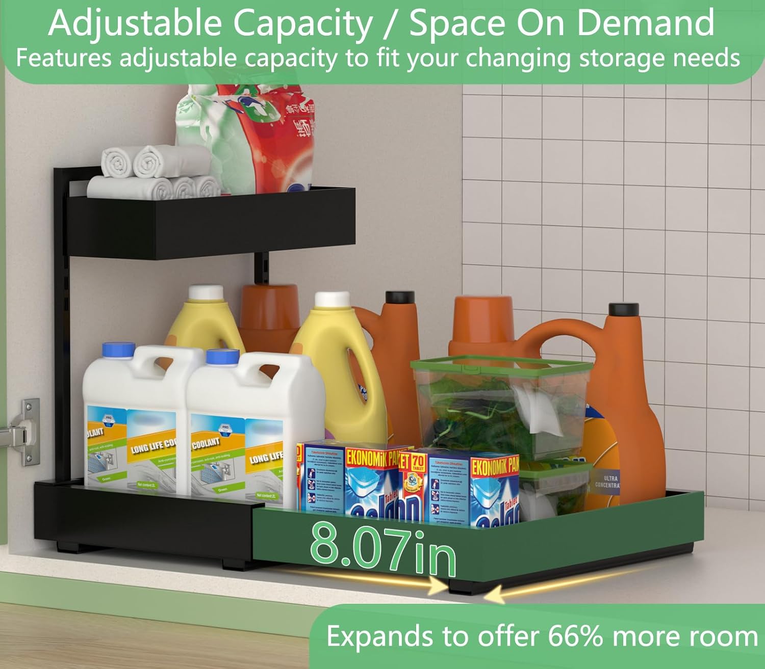 - Expandable Baskets - Ultimate Under-Sink Storage Solution Industry-exclusive expandable design instantly adds 66% storage space – perfect for under kitchen sink organizers and storage. Holds bulky detergent jugs & cleaning supplies with no space waste