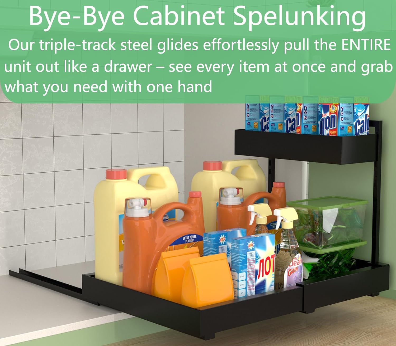 - 3-Slide Rail System: Buttery 8-Inch Full Extension Heavy-duty triple steel glides (not plastic!) enable smooth pull-out under sink drawers action. Reach back-corner items in under cabinet storage without kneeling or spills