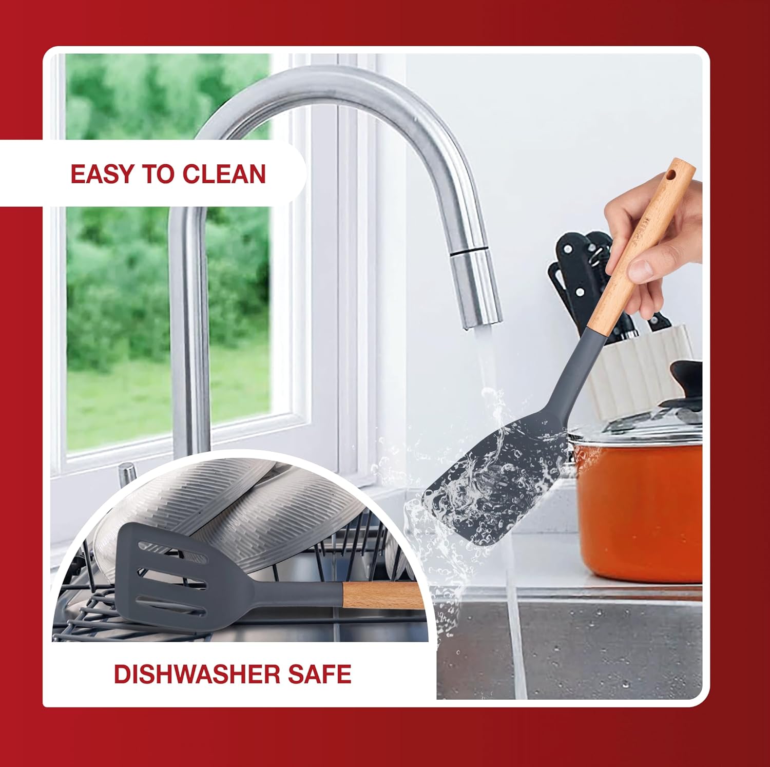 - THOUGHTFUL AND SAFE DESIGN: The natural wooden handles of turner spatula won’t rust or break like metal utensils, so they last longer. Plus, they don’t get hot while cooking, keeping your hands safe from burns and making them comfortable to hold during long cooking sessions.