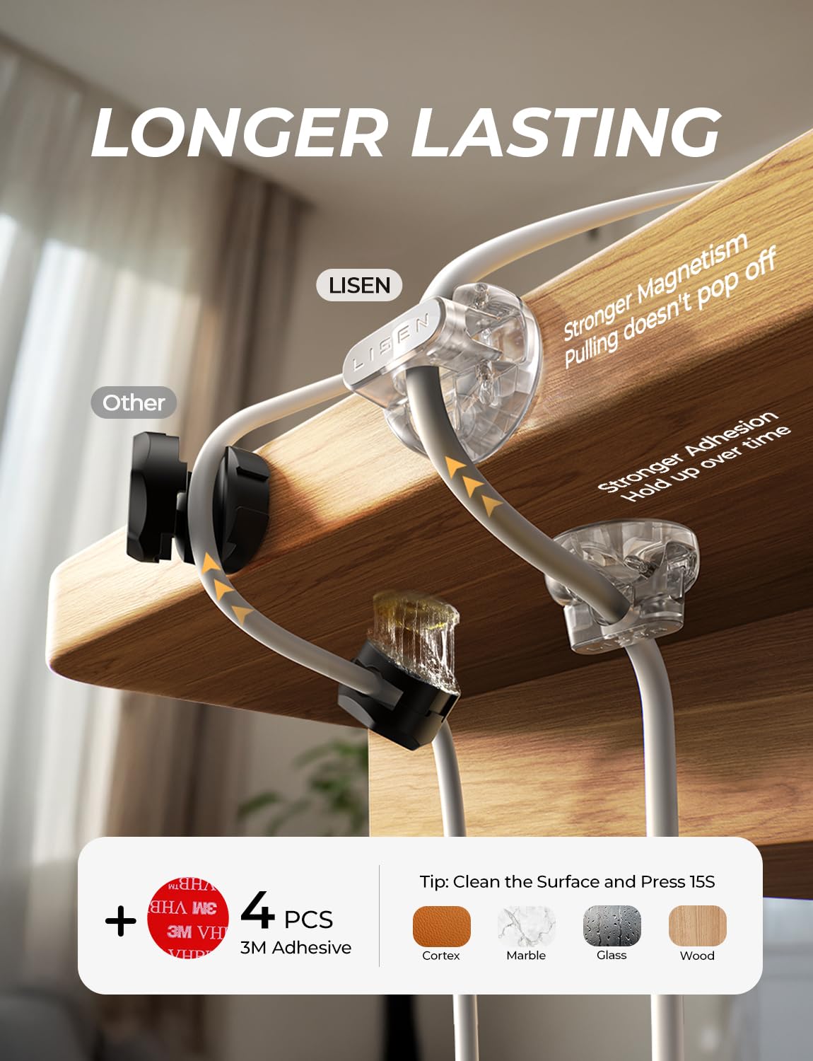 - No-Residue, High-Strength Adhesive: LISEN cord organizer for desk uses premium acrylic adhesive, stronger than 3M tape and leaves no residue. With 4 extra adhesive pads, magnetic clips has strong adhesion and flexible installation. Wire organizers for cords can firmly stick to smooth and dry surfaces like wood, glass and ceramic tiles. The transparent pads won't damage furniture, suitable for home and office. Easily manage and tidy up cords, improving space neatness and functionality