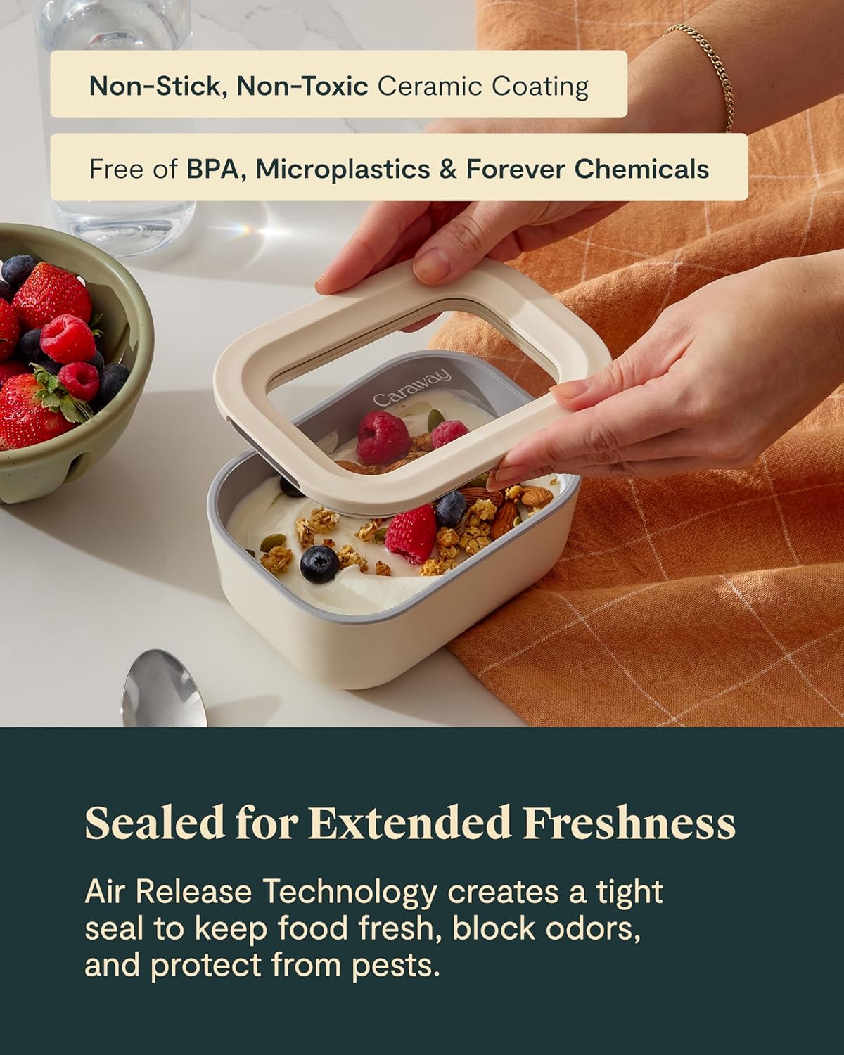 Caraway 6pc Glass Food Storage Set - 2.6 Cup Storage Containers For Food (6) - Non-Toxic Ceramic-Coated Glass - Air Release Technology - Compact & Stackable Design - Cream