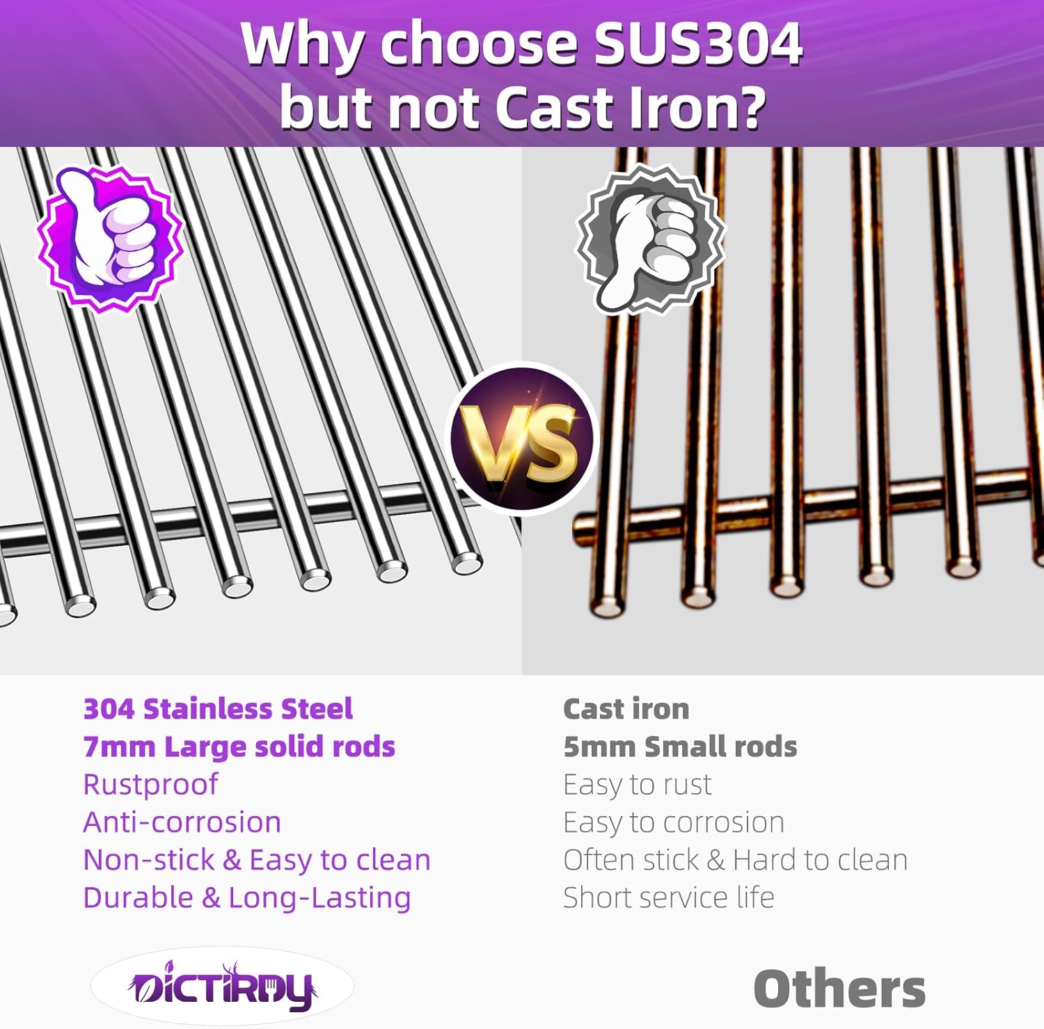 - 【Safe Material & Protect Your Hands】Dictirdy grill replacement parts are made of high-quality 100% food grade 304 heavy stainless steel and well-engineered to prevent rust, which is durable with uniform heating and high corrosion resistance, much more heavier and heavy duty. Our cooking grill grate with edge grinding design is free of sharp edges, made with nice welds and smooth surface, no sharp edges and will not hurt your hands. Best choice for your weber genesis ii grills.