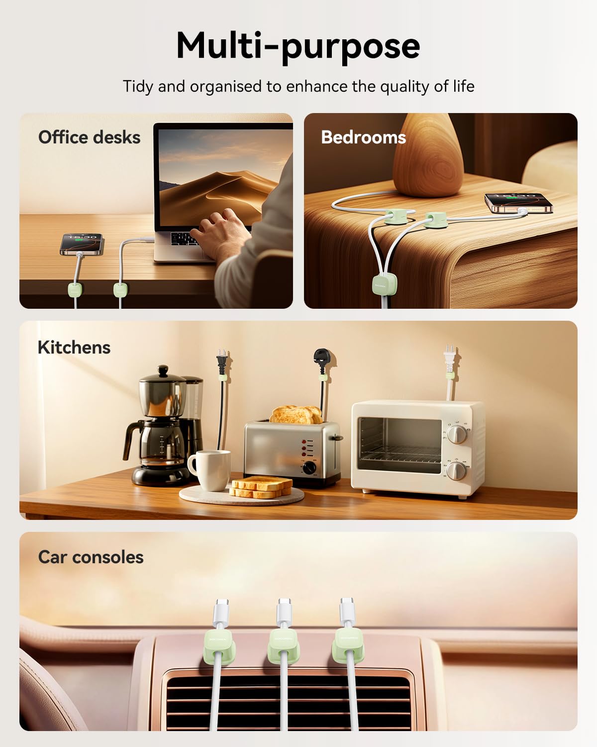 - Full-Scene Solution:Desk accessories with 6-Pack Cord Organizer can be flexibly arranged in office desks, computer desks, walls, car instrument panels and other scenarios, and centrally manage charging cables, data cables, and power cables.Mini-free space is not used to create a minimalist desktop (Clutter-Free Desk).