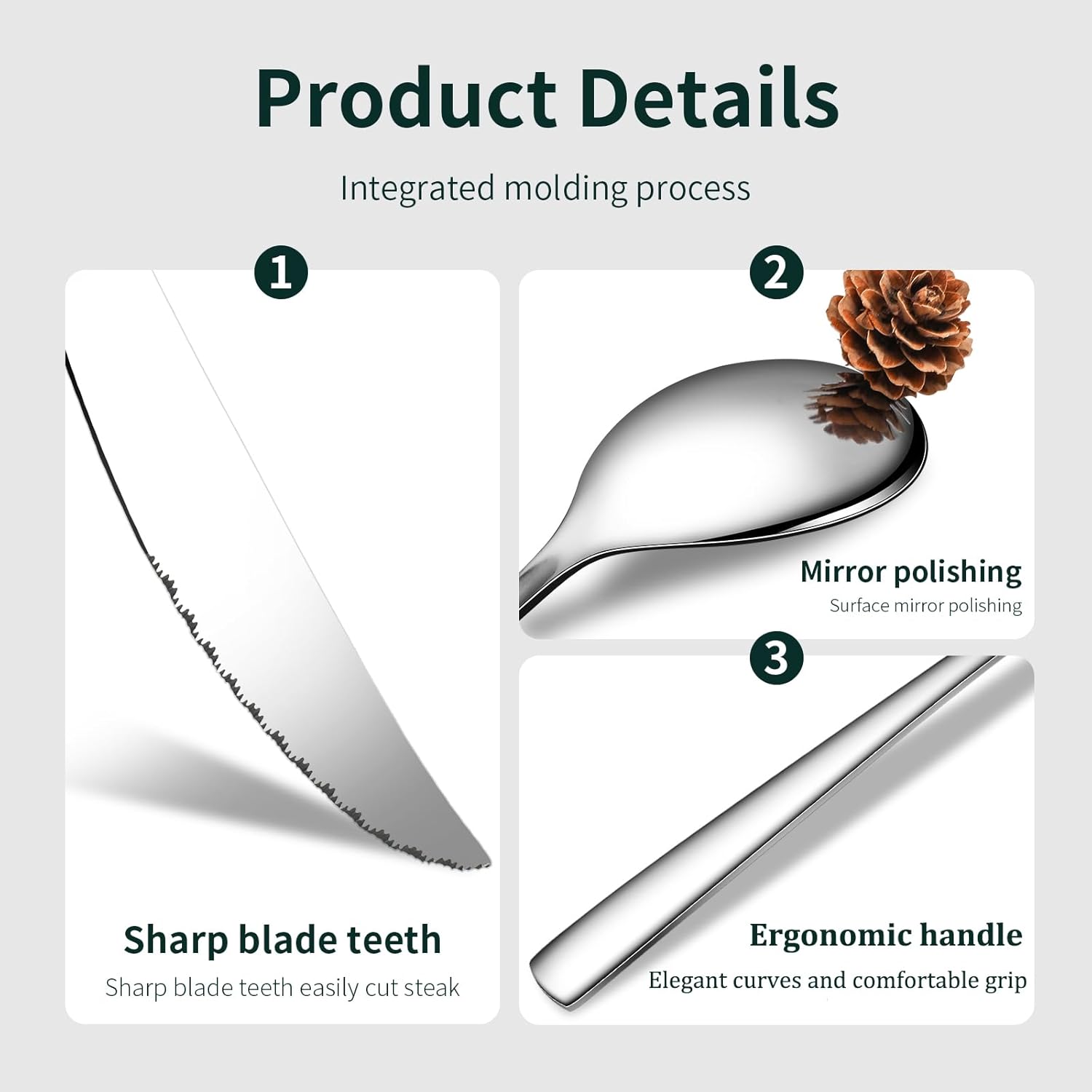 - Unique and comfortable handles: Unlike other cutlery set, the handles of this set are ergonomically designed with a slight curve that perfectly fits the natural curve of your hand. The balanced weight and comfortable grip reduce fatigue, providing maximum comfort during use