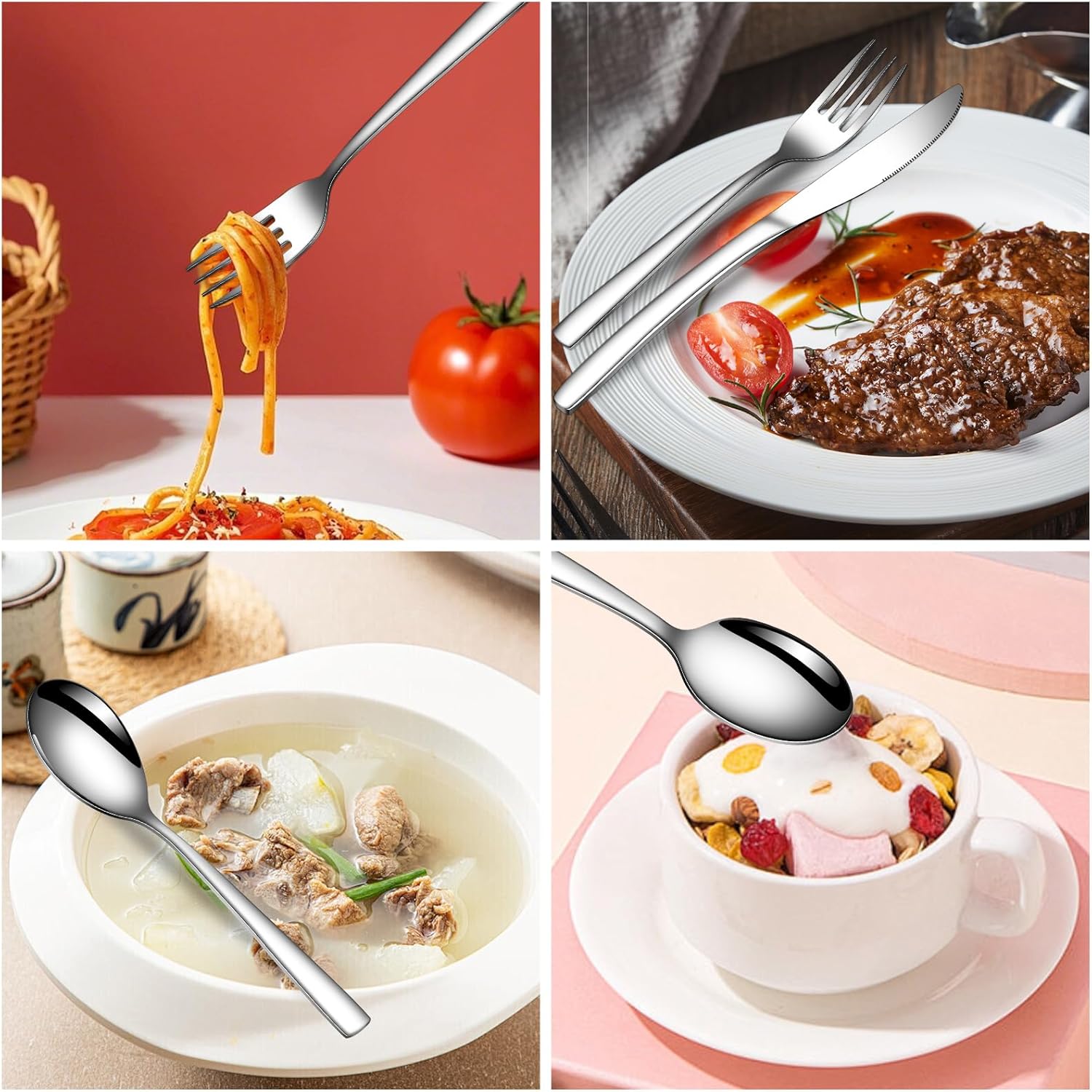 - 20-Piece Flatware Set for 4: Our 20-piece silverware set includes 4 dinner spoons, 4 mini teaspoons, 4 dinner forks, 4 dinner knives, and 4 bonus steak knives. Say goodbye to mid-meal utensil shortages β these kitchen silverware sets seamlessly adapts to any occasion, making it a must-have for every home