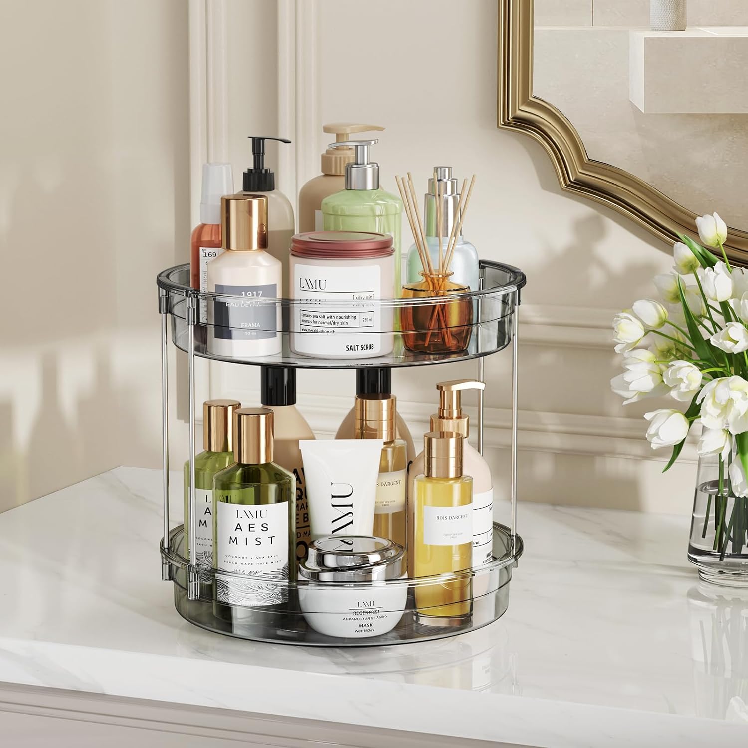 - SPACIOUS 12-INCH DESIGN: With 12" diameter, LAMU's large lazy Susan stores bulkier kitchen jars, tall skincare bottles, and family-sized condiments effortlessly. Perfectly as a pantry organizer for cabinet corners, fridge shelf spinner, or vanity tray for bathroom counter. Extra capacity meets versatile storage needs anywhere