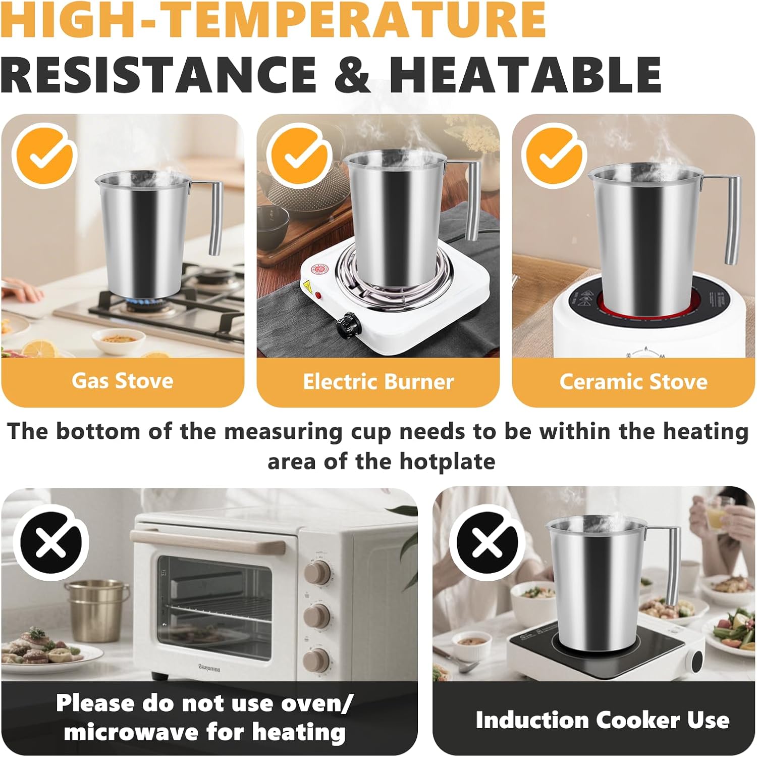 - High Temperature Resistance and Heatability: This stainless steel measuring pitcher is suitable for use on electric burners, ceramic stoves and gas stoves, but not suitable for induction cooktops. For open-flame use, maintain low-to-medium heat (ensure the flame does not exceed the base diameter to prevent damage)
