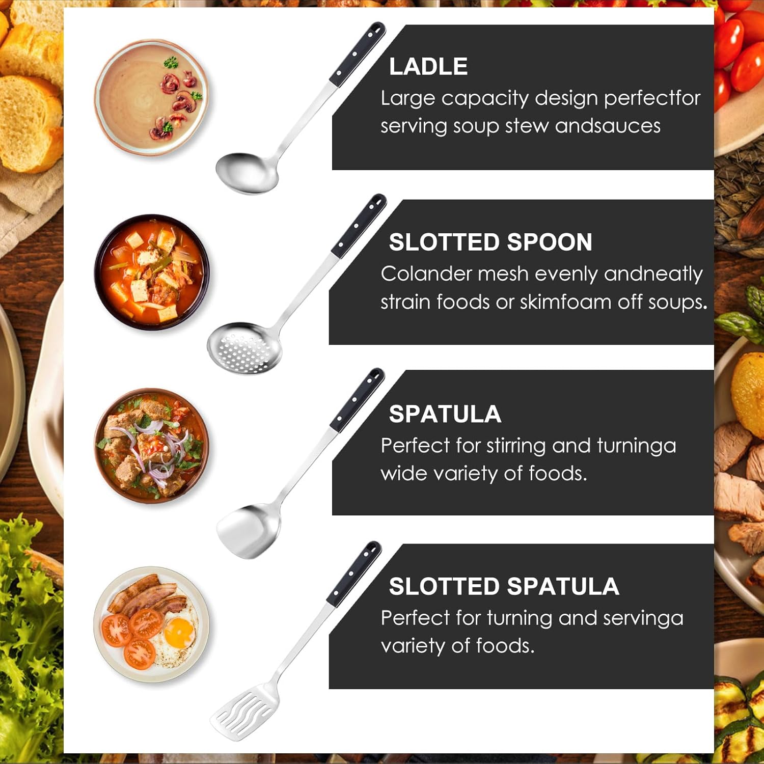 - 【Ergonomic Heat-Resistant Handle】These kitchen utensils feature seamless one-piece stainless steel construction. The handles combine high-quality PP material layered over a stainless steel core, anchored with triple rivets for maximum strength. This design delivers both durability and style, while the PP handle effectively shields your hands from heat during cooking and serving. The wok utensils ergonomic handle for easily holding that more comfortable and secure for you to use