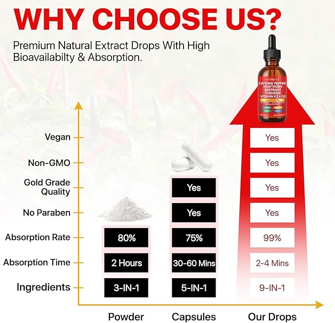 • 【Natural Formula】This Chili Drop Is A Combination Of Chili Powder, Hawthorn, Turmeric, Beetroot, Vitamin K2+D3 And Other Natural Nutrients, Scientifically Formulated To Fully Support Metabolism, Immune Health And Digestive Function.