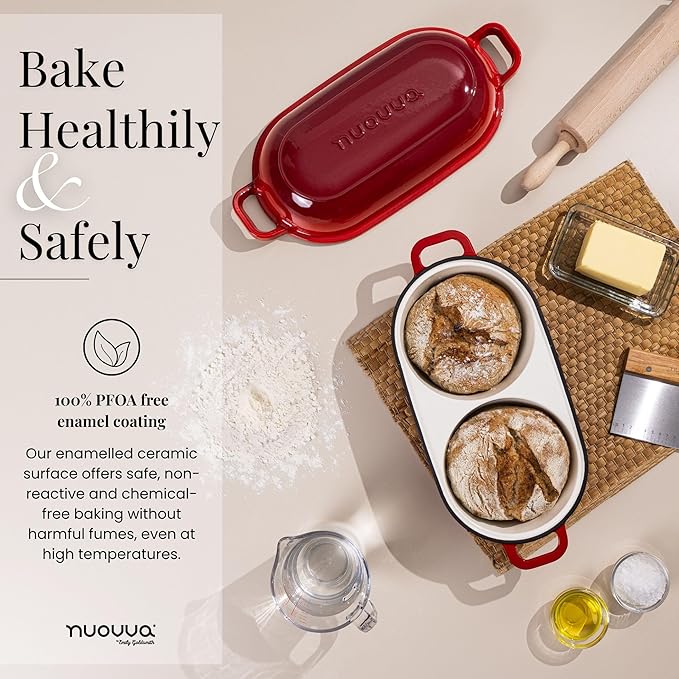 Dutch Oven For Sourdough Bread Baking – Enamelled Cast Iron Bread Loaf Pot – 500°F Oven Safe Non Stick Bread Pot – Double Round Loaf Space, 16.5cm Diameter, Red, – by Nuovva