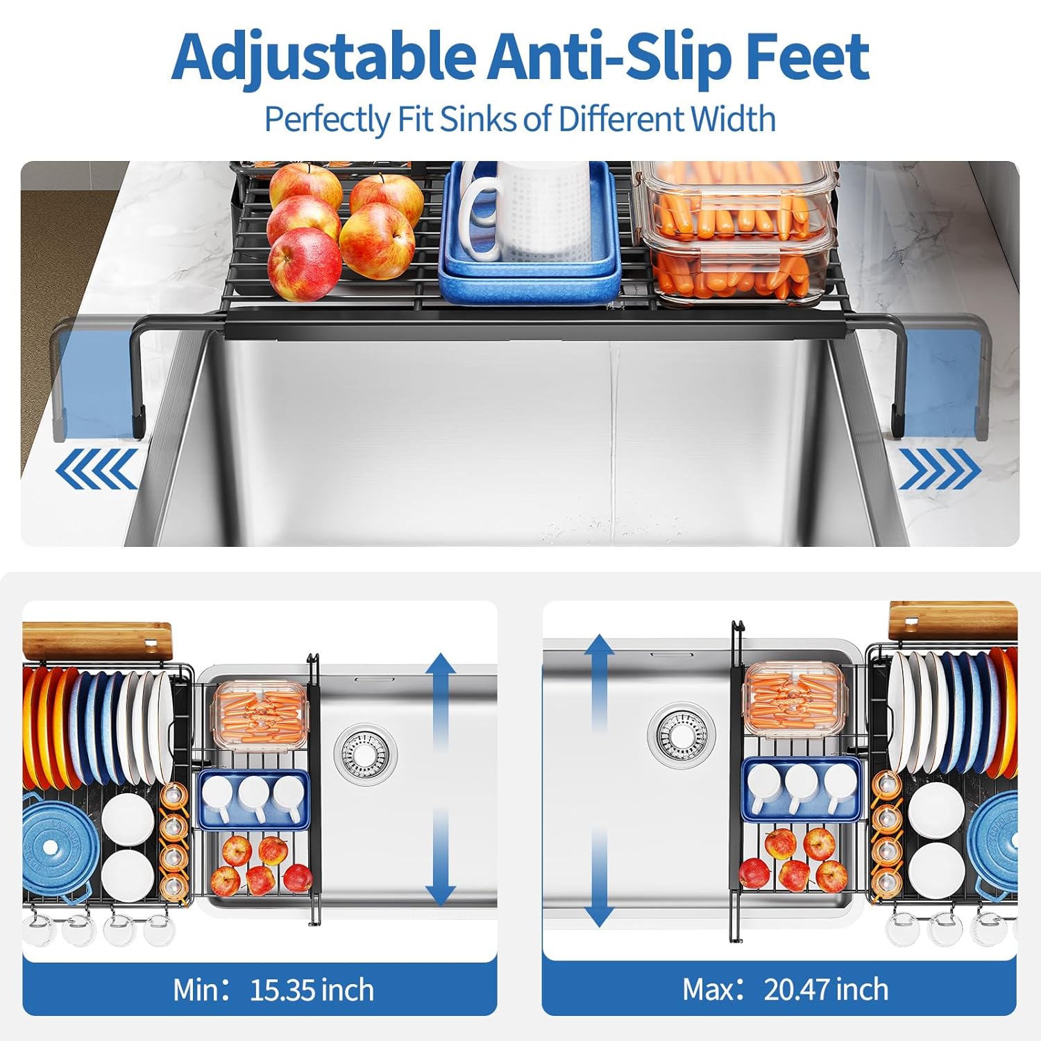 - Adjustable & Space-Saving: The expandable feature allows you to adjust the rack to fit your specific kitchen setup, making it a space-saving solution for both small and large kitchens. 2-feet can be easily adjusted from 15.4" to 20.5", it means if your kitchen sink's width is between 15.4"and 20.5". The compact design ensures it doesn't take up unnecessary counter space.