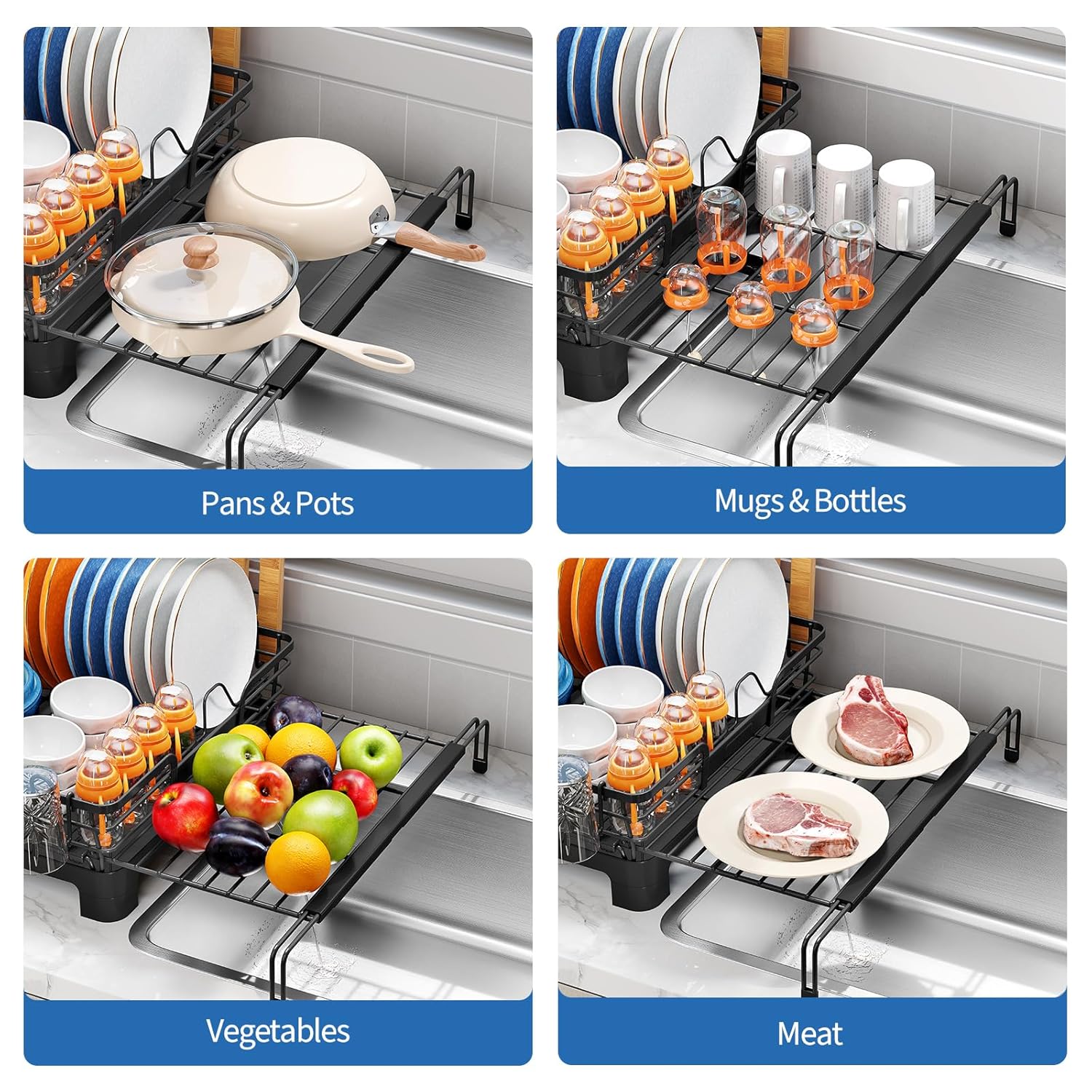 - Multi-Functional Extendable Over Sink Rack: Beyond just storing dishes, this rack is ideal for organizing vegetables, fruits, lunch boxes, mugs, and spice bottles. Its versatile design ensures that your countertops remain clean and organized.