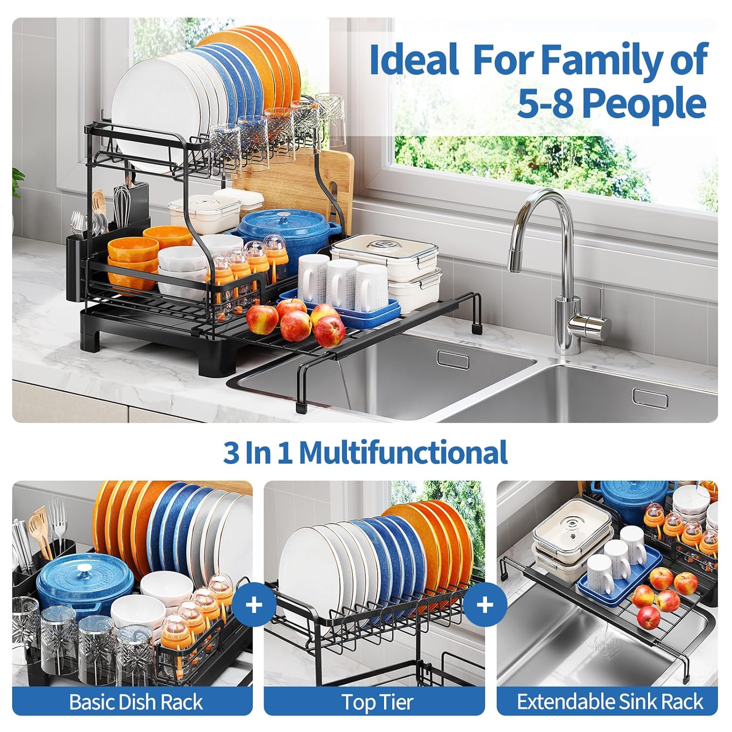 - 3-in-1 Multi-Purpose & Large Capacity: The 2-tier expandable dish drying rack combines an extendable, over-sink, and multi-functional design. It can hold up to 14 plates, 12 bowls, 5 glasses, and more, providing ample storage space for various kitchen items.