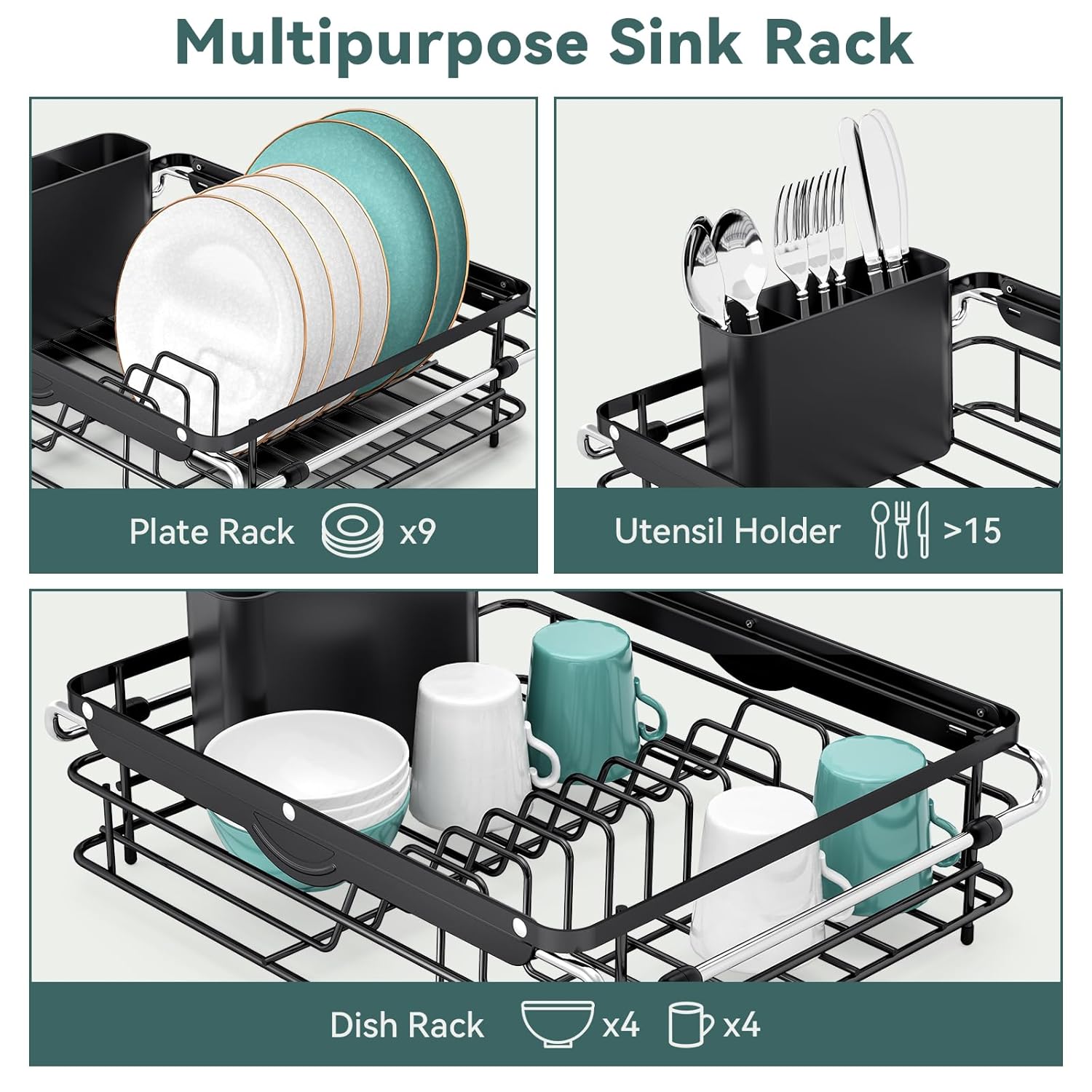 - [MULTIPURPOSE SINK RACK]: This dish drying rack is suitable for families of 3-4 people. It can hold 9 plates, cups, bowls, and over 15 tablewares. In addition to drying dishes, this dish rack can also be used to drain fresh vegetables and fruits for everyday use