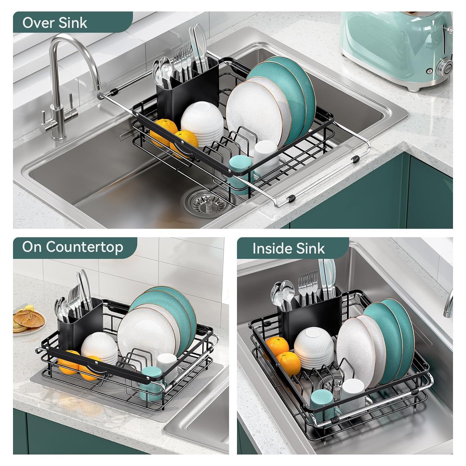 - [3 IN 1 MULTI-USAGE]: Dish drying rack for kitchen counter combined with 3-IN-1 design,This dish rack expands for use on the countertop, in-sink or over-sink,It meets your different needs for tableware storage and drainage, thanks to its expandable design that adapts to various spaces.