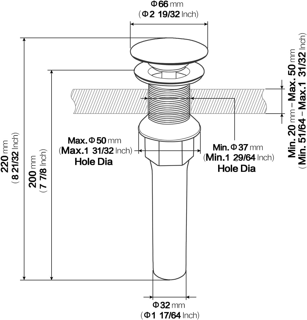 - 【STANDARD 1 3/4" DRAIN OPENING】-Fits bathroom sink hole diameter 1.46-inch to 1.9-inch. MAX. Sink thickness 1.97-inch. Tailpiece diameter: 1 1/4". The vertical distance from the sink drain hole to the P-trap is 7-7/8". Ideal for sinks NO overflow.