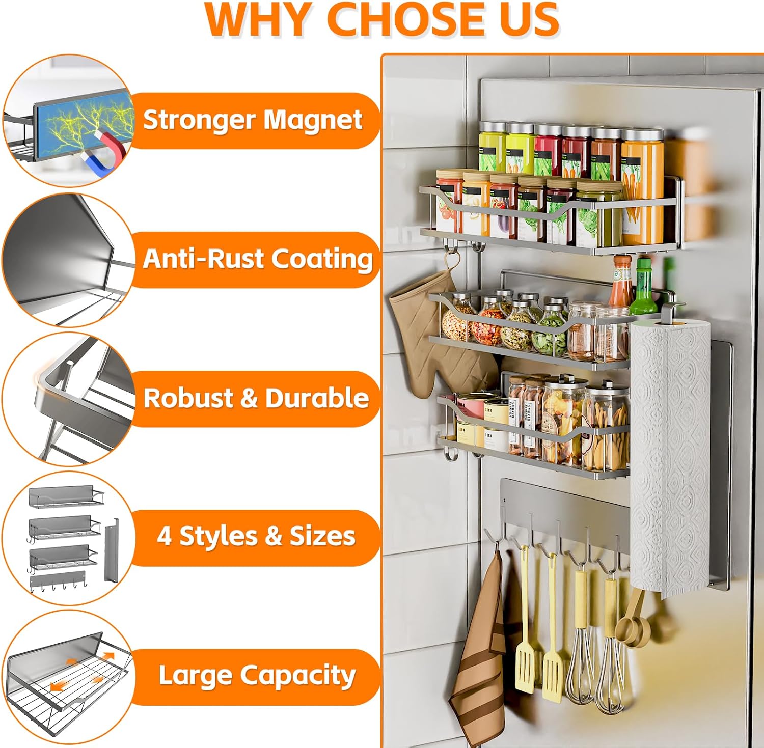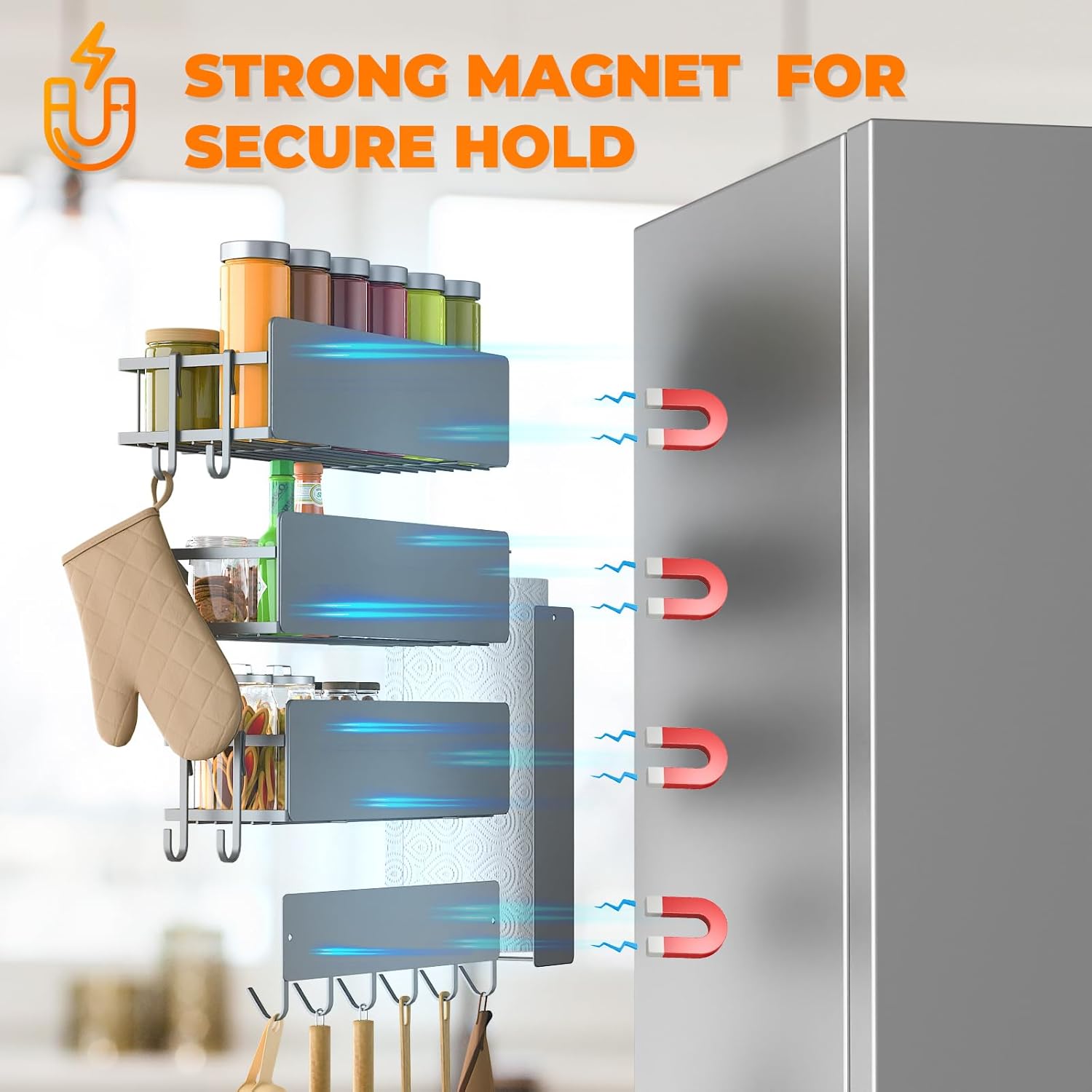 - MAGNETIC SPICE RACK FOR REFRIGERATOR: Perfect for organizing your salt, oil, spice jars, and kitchen utensils on the side of your refrigerator. Say goodbye to cluttered countertops and hello to a more efficient kitchen.