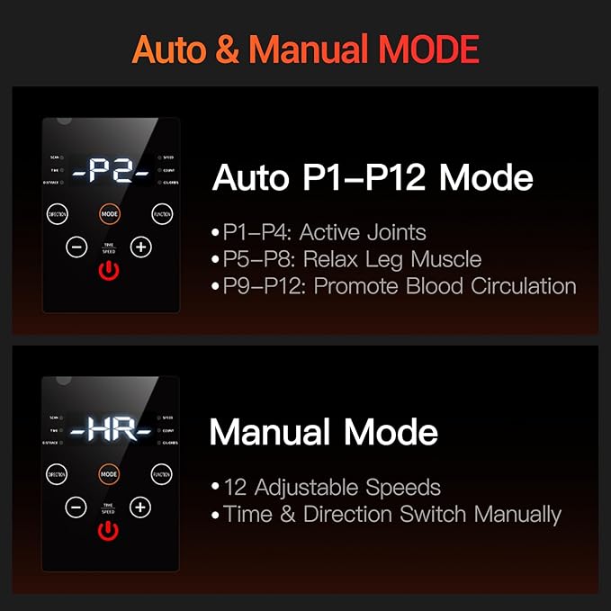 • Auto & Manual Mode: In manual mode, you can take full control with 12 adjustable speeds,15-30mins,and direction (forward/backward). In the P1-P12 auto mode, the elliptical machine running system speed and direction have been preset, the running direction automatically switches every 3 minutes, and the speed increases every minute